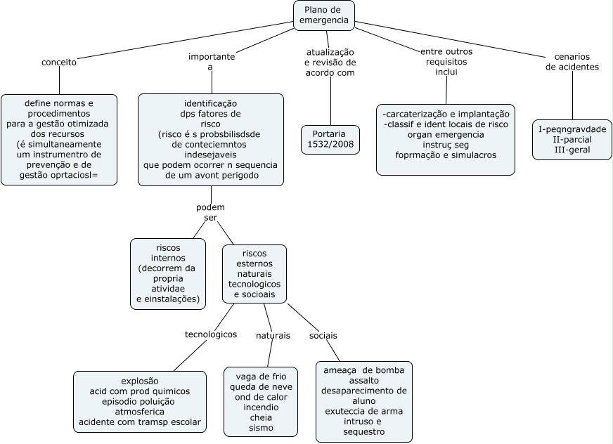 Esse mapa conceitual, produzido no IHMC CmapTools, tem a informação relacionada a: emergencia_2, Plano de emergencia entre outros requisitos inclui -carcaterização e implantação -classif e ident locais de risco organ emergencia instruç seg foprmação e simulacros, Plano de emergencia importante a identificação dps fatores de risco (risco é s probsbilisdsde de conteciemntos indesejaveis que podem ocorrer n sequencia de um avont perigodo, identificação dps fatores de risco (risco é s probsbilisdsde de conteciemntos indesejaveis que podem ocorrer n sequencia de um avont perigodo podem ser riscos internos (decorrem da propria atividae e einstalações), Plano de emergencia atualização e revisão de acordo com Portaria 1532/2008, riscos esternos naturais tecnologicos e socioais naturais vaga de frio queda de neve ond de calor incendio cheia sismo, riscos esternos naturais tecnologicos e socioais sociais ameaça de bomba assalto desaparecimento de aluno exuteccia de arma intruso e sequestro, Plano de emergencia cenarios de acidentes I-peqngravdade II-parcial III-geral, Plano de emergencia conceito define normas e procedimentos para a gestão otimizada dos recursos (é simultaneamente um instrumentro de prevenção e de gestão oprtaciosl=, identificação dps fatores de risco (risco é s probsbilisdsde de conteciemntos indesejaveis que podem ocorrer n sequencia de um avont perigodo podem ser riscos esternos naturais tecnologicos e socioais, riscos esternos naturais tecnologicos e socioais tecnologicos explosão acid com prod quimicos episodio poluição atmosferica acidente com tramsp escolar