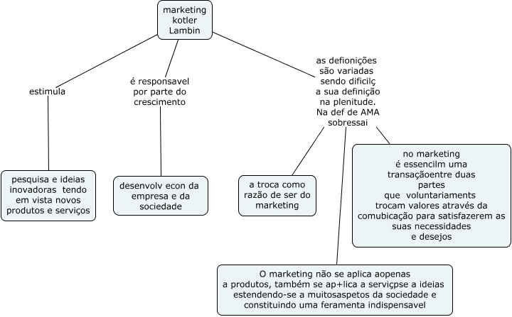 Esse mapa conceitual, produzido no IHMC CmapTools, tem a informação relacionada a: marketing_geral, marketing kotler Lambin é responsavel por parte do crescimento desenvolv econ da empresa e da sociedade, marketing kotler Lambin as defionições são variadas sendo dificilç a sua definição na plenitude. Na def de AMA sobressai no marketing é essencilm uma transaçãoentre duas partes que voluntariaments trocam valores através da comubicação para satisfazerem as suas necessidades e desejos, marketing kotler Lambin as defionições são variadas sendo dificilç a sua definição na plenitude. Na def de AMA sobressai O marketing não se aplica aopenas a produtos, também se ap+lica a serviçpse a ideias estendendo-se a muitosaspetos da sociedade e constituindo uma feramenta indispensavel, marketing kotler Lambin as defionições são variadas sendo dificilç a sua definição na plenitude. Na def de AMA sobressai a troca como razão de ser do marketing, marketing kotler Lambin estimula pesquisa e ideias inovadoras tendo em vista novos produtos e serviços