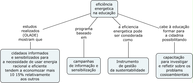 Esse mapa conceitual, produzido no IHMC CmapTools, tem a informação relacionada a: eficiência energetica_geral_2_edu, eficiência energetica na educação cabe à educação formar para a cidadnia possibilitando capacitação para investigar e refletir sobre os problams cosioambientais, eficiência energetica na educação programa baseado em campanhas de informação e sensibilização, eficiência energetica na educação estudos realizados (OLADE) mostram que cidadaos informados e sensibilizados para a necessidade de usar energia racional e eficiente tendem a economozar mais 10 15% relativamente aos outros, eficiência energetica na educação a eficiencia energetica pode ser considerada como Instrumento de gestão da sustentabilidade