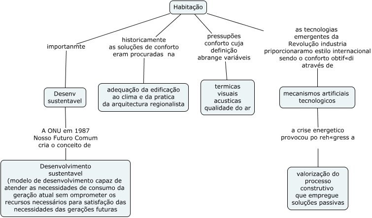 Esse mapa conceitual, produzido no IHMC CmapTools, tem a informação relacionada a: eficiência energetica_geral_4_sustent, Desenv sustentavel A ONU em 1987 Nosso Futuro Comum cria o conceito de Desenvolvimento sustentavel (modelo de desenvolvimento capaz de atender as necessidades de consumo da geração atual sem omprometer os recursos necessários para satisfação das necessidades das gerações futuras, Habitação importanmte Desenv sustentavel, Habitação historicamente as soluções de conforto eram procuradas na adequação da edificação ao clima e da pratica da arquitectura regionalista, Habitação as tecnologias emergentes da Revolução industria priporcionaramo estilo internacional sendo o conforto obtif«di através de mecanismos artificiais tecnologicos, mecanismos artificiais tecnologicos a crise energetico provocou po reh«gress a valorização do processo construtivo que empregue soluções passivas, Habitação pressupões conforto cuja definição abrange variáveis termicas visuais acusticas qualidade do ar