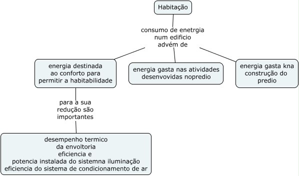 Esse mapa conceitual, produzido no IHMC CmapTools, tem a informação relacionada a: eficiência energetica_geral_5_energ hab, Habitação consumo de enetrgia num edificio advém de energia gasta kna construção do predio, energia destinada ao conforto para permitir a habitabilidade para a sua redução são importantes desempenho termico da envoltoria eficiencia e potencia instalada do sistemna iluminação eficiencia do sistema de condicionamento de ar, Habitação consumo de enetrgia num edificio advém de energia destinada ao conforto para permitir a habitabilidade, Habitação consumo de enetrgia num edificio advém de energia gasta nas atividades desenvovidas nopredio
