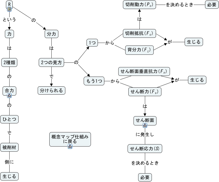 このコンセプトマップに関連する情報: 話題:合力(R), 2つの見方 の もう1つ, <math xmlns="http://www.w3.org/1998/Math/MathML"> <mrow> <mtext> せん断力( </mtext> <mmultiscripts> <mtext> F </mtext> <mtext> s </mtext> <none/> </mmultiscripts> <mtext> ) </mtext> </mrow> </math> が 生じる, <math xmlns="http://www.w3.org/1998/Math/MathML"> <mrow> <mtext> せん断面垂直抗力( </mtext> <mmultiscripts> <mtext> F </mtext> <mtext> n </mtext> <none/> </mmultiscripts> <mtext> ) </mtext> </mrow> </math> が 生じる, 被削材 側に 生じる, <math xmlns="http://www.w3.org/1998/Math/MathML"> <mrow> <mtext> 切削抵抗( </mtext> <mmultiscripts> <mtext> F </mtext> <mtext> c </mtext> <none/> </mmultiscripts> <mtext> ) </mtext> </mrow> </math> が 生じる, もう1つ から <math xmlns="http://www.w3.org/1998/Math/MathML"> <mrow> <mtext> せん断面垂直抗力( </mtext> <mmultiscripts> <mtext> F </mtext> <mtext> n </mtext> <none/> </mmultiscripts> <mtext> ) </mtext> </mrow> </math>, せん断応力(S) を決めるとき 必要, 力 は 2種類, せん断面 に発生し せん断応力(S), 2つの見方 で 分けられる, 合力 の ひとつ, R という 力, <math xmlns="http://www.w3.org/1998/Math/MathML"> <mrow> <mtext> 背分力( </mtext> <mmultiscripts> <mtext> F </mtext> <mtext> t </mtext> <none/> </mmultiscripts> <mtext> ) </mtext> </mrow> </math> が 生じる, 分力 は 2つの見方, <math xmlns="http://www.w3.org/1998/Math/MathML"> <mrow> <mtext> 切削動力( </mtext> <mmultiscripts> <mtext> P </mtext> <mtext> c </mtext> <none/> </mmultiscripts> <mtext> ) </mtext> </mrow> </math> を決めるとき 必要, 1つ から <math xmlns="http://www.w3.org/1998/Math/MathML"> <mrow> <mtext> 切削抵抗( </mtext> <mmultiscripts> <mtext> F </mtext> <mtext> c </mtext> <none/> </mmultiscripts> <mtext> ) </mtext> </mrow> </math>, <math xmlns="http://www.w3.org/1998/Math/MathML"> <mrow> <mtext> 切削抵抗( </mtext> <mmultiscripts> <mtext> F </mtext> <mtext> c </mtext> <none/> </mmultiscripts> <mtext> ) </mtext> </mrow> </math> は <math xmlns="http://www.w3.org/1998/Math/MathML"> <mrow> <mtext> 切削動力( </mtext> <mmultiscripts> <mtext> P </mtext> <mtext> c </mtext> <none/> </mmultiscripts> <mtext> ) </mtext> </mrow> </math>, 2種類 の 合力, <math xmlns="http://www.w3.org/1998/Math/MathML"> <mrow> <mtext> せん断力( </mtext> <mmultiscripts> <mtext> F </mtext> <mtext> s </mtext> <none/> </mmultiscripts> <mtext> ) </mtext> </mrow> </math> は せん断面, 2つの見方 の 1つ