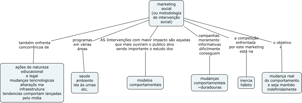 Esse mapa conceitual, produzido no IHMC CmapTools, tem a informação relacionada a: marketing social 2, marketing social (ou metodologia de intervenção social) o objetivo é mudança real do comportamento e seja mantido indefinidamente, marketing social (ou metodologia de intervenção social) programas em várias áreas saude ambiente ida às urnas etc., marketing social (ou metodologia de intervenção social) campanhas meramente informativas dificilmente conseguem mudanças comportamentais ~duradouras, marketing social (ou metodologia de intervenção social) a competição enfrentada por este marketing está na inercia hábito, marketing social (ou metodologia de intervenção social) também enfrenta concorrêncoa de ações de natureza ediucacional e legal mudanças tencnologicas altaraçõs ma infraestrutura tendencias comportam lançadas pelo midia, marketing social (ou metodologia de intervenção social) AS Iintervenções com maior impacto são aquelas que mais ouviram o publico alvo sendo importante o estudo dos modelos comportamentais