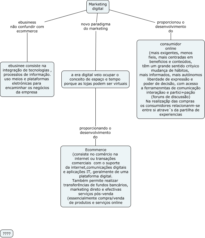 Esse mapa conceitual, produzido no IHMC CmapTools, tem a informação relacionada a: marketing_3, Marketing digital ebusiness não confundir com ecommerce ebusinee consiste na integração de tecnologias , processlos de informação. uso meios e plataformas eletrónicas para encaminhar os negócios da empresa, Marketing digital proporcionou o desenvolvimento do consumidor online (mais exigentes, menos fieis, mais centradas em beneficios e conteúdos, têm um grande sentido crityico mudança de hábitos, mais informados, mais autónomos liberdade de expressão e poder de decisão, com acesso a ferramenmtas de comunicação interaçãao e partici+pação (foruns de discussão) Na realizaçãp das compras os consumidores relacionanm-se entre si atrave´s da partilha de experiencias, a era digital veio ocupar o conceito de espaço e tempo porque as lojas podem ser virtuais proporcionando o desenvolvimento do Ecommerce (consiste no comércio na internet ou transações comerciais com o suporte da internet,comunicações digitais e aplicações IT, geralmente de uma plataforma digital. Também permite realizar transferências de fundos bancários, marketing direto e efectivas serviços pós-venda (essencialmente compra/venda de produtos e serviços online, Marketing digital novo paradigma do marketing a era digital veio ocupar o conceito de espaço e tempo porque as lojas podem ser virtuais