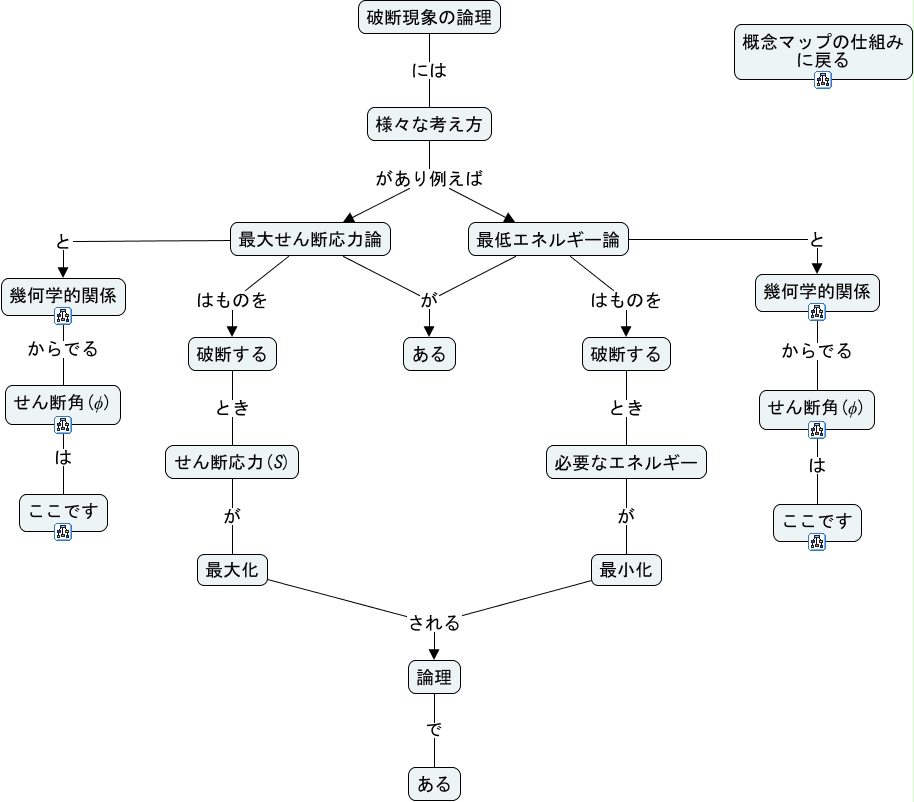 このコンセプトマップに関連する情報: 話題:破断現象の論理, 論理 で ある, 様々な考え方 があり例えば 最大せん断応力論, 破断する とき せん断応力(S), 破断する とき 必要なエネルギー, 様々な考え方 があり例えば 最低エネルギー論, 必要なエネルギー が 最小化, 最大せん断応力論 が ある, 最小化 される 論理, せん断応力(S) が 最大化, 最低エネルギー論 はものを 破断する, 最大せん断応力論 はものを 破断する, 最大せん断応力論 と 幾何学的関係, 幾何学的関係 からでる せん断角(ϕ), 破断現象の論理 には 様々な考え方, せん断角(ϕ) は ここです, 最低エネルギー論 と 幾何学的関係, 幾何学的関係 からでる せん断角(ϕ), 最大化 される 論理, せん断角(ϕ) は ここです, 最低エネルギー論 が ある