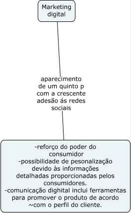 Esse mapa conceitual, produzido no IHMC CmapTools, tem a informação relacionada a: marketing_4, Marketing digital aparecimento de um quinto p com a crescente adesão ás redes sociais -reforço do poder do consumidor -possibilidade de pesonalização devido às informações detalhadas proporcionadas pelos consumidores. -comunicação dighital inclui ferramentas para promover o produto de acordo ~com o perfil do cliente.