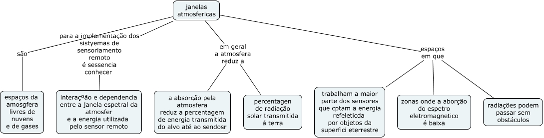 Esse mapa conceitual, produzido no IHMC CmapTools, tem a informação relacionada a: sensor remoto, janelas atmosfericas espaços em que trabalham a maior parte dos sensores que cptam a energia refeleticda por objetos da superfici eterrestre, janelas atmosfericas são espaços da amosgfera livres de nuvens e de gases, janelas atmosfericas espaços em que zonas onde a aborção do espetro eletromagnetico é baixa, janelas atmosfericas em geral a atmosfera reduz a a absorção pela atmosfera reduz a percentagem de energia transmitida do alvo até ao sendosr, janelas atmosfericas para a implementação dos sistyemas de sensoriamento remoto é sessencia conhecer interaçºão e dependencia entre a janela espetral da atmosfer e a energia utilizada pelo sensor remoto, janelas atmosfericas espaços em que radiações podem passar sem obstáculos, janelas atmosfericas em geral a atmosfera reduz a percentagen de radiação solar transmitida á terra