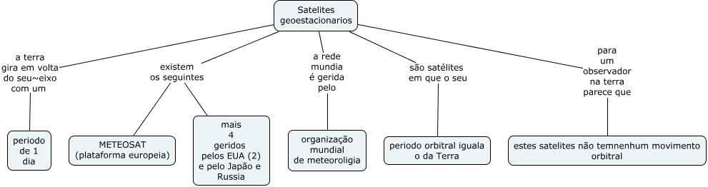 Esse mapa conceitual, produzido no IHMC CmapTools, tem a informação relacionada a: satelite geoestacionarios, Satelites geoestacionarios a rede mundia é gerida pelo organização mundial de meteoroligia, Satelites geoestacionarios a terra gira em volta do seu~eixo com um periodo de 1 dia, Satelites geoestacionarios existem os seguintes mais 4 geridos pelos EUA (2) e pelo Japão e Russia, Satelites geoestacionarios para um observador na terra parece que estes satelites não temnenhum movimento orbitral, Satelites geoestacionarios são satélites em que o seu periodo orbitral iguala o da Terra, Satelites geoestacionarios existem os seguintes METEOSAT (plataforma europeia)