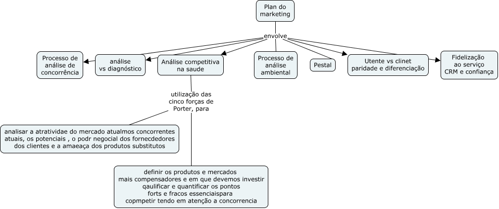 Esse mapa conceitual, produzido no IHMC CmapTools, tem a informação relacionada a: plan_marketing_4, Análise competitiva na saude utilização das cinco forças de Porter, para definir os produtos e mercados mais compensadores e em que devemos investir qaulificar e quantificar os pontos forts e fracos essenciaispara copmpetir tendo em atenção a concorrencia, Plan do marketing envolve Análise competitiva na saude, Análise competitiva na saude utilização das cinco forças de Porter, para analisar a atratividae do mercado atualmos concorrentes atuais, os potenciais , o podr negocial dos fornecdedores dos clientes e a amaeaça dos produtos substitutos, Plan do marketing envolve análise vs diagnóstico, Plan do marketing envolve Processo de análise de concorrência, Plan do marketing envolve Utente vs clinet paridade e diferenciação, Plan do marketing envolve Processo de análise ambiental, Plan do marketing envolve Fidelização ao serviço CRM e confiança, Plan do marketing envolve Pestal