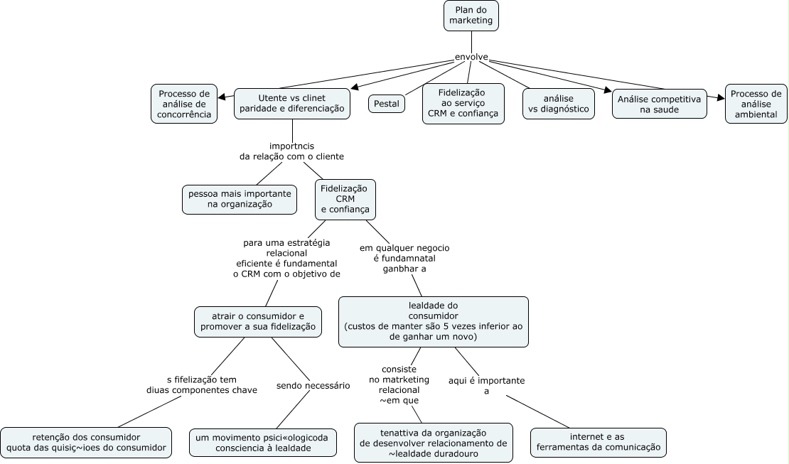 Esse mapa conceitual, produzido no IHMC CmapTools, tem a informação relacionada a: plan_marketing_5, Plan do marketing envolve Processo de análise de concorrência, Plan do marketing envolve Processo de análise ambiental, atrair o consumidor e promover a sua fidelização sendo necessário um movimento psici«ologicoda consciencia à lealdade, Fidelização CRM e confiança em qualquer negocio é fundamnatal ganbhar a lealdade do consumidor (custos de manter são 5 vezes inferior ao de ganhar um novo), Plan do marketing envolve Fidelização ao serviço CRM e confiança, atrair o consumidor e promover a sua fidelização s fifelização tem diuas componentes chave retenção dos consumidor quota das quisiç~ioes do consumidor, Utente vs clinet paridade e diferenciação importncis da relação com o cliente Fidelização CRM e confiança, Fidelização CRM e confiança para uma estratégia relacional eficiente é fundamental o CRM com o objetivo de atrair o consumidor e promover a sua fidelização, Plan do marketing envolve Análise competitiva na saude, Utente vs clinet paridade e diferenciação importncis da relação com o cliente pessoa mais importante na organização, Plan do marketing envolve análise vs diagnóstico, Plan do marketing envolve Utente vs clinet paridade e diferenciação, Plan do marketing envolve Pestal, lealdade do consumidor (custos de manter são 5 vezes inferior ao de ganhar um novo) consiste no matrketing relacional ~em que tenattiva da organização de desenvolver relacionamento de ~lealdade duradouro, lealdade do consumidor (custos de manter são 5 vezes inferior ao de ganhar um novo) aqui é importante a internet e as ferramentas da comunicação