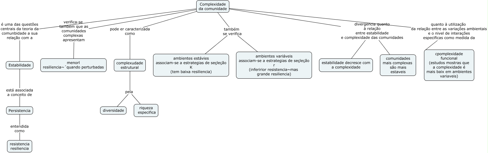 Esse mapa conceitual, produzido no IHMC CmapTools, tem a informação relacionada a: comunidades 3, Complexidade da comunidade também se verifica ambientes estávies associam-se a estrategias de seçleção K (tem baixa resiliencia), Complexidade da comunidade divergencia quanto à relação entre estabilidade e complexidade das comunidades estabilidade decresce com a complexidade, complexudade estrutural pela diversidade, Complexidade da comunidade pode er caracterizada como complexudade estrutural, Persistencia entendida como resistencia resiliencia, complexudade estrutural pela riqueza especifica, Complexidade da comunidade verifica-se também que as comunidades complexas apresentam menorl resiliencia~´quando perturbadas, Complexidade da comunidade também se verifica ambientes variáveis associam-se a estrategias de seçleção r (inferirior resistencia~mas grande resiliencia), Complexidade da comunidade quanto à utilização da relação entre as variações ambientais e o nivel de interações especificas como medida da cpomplexidade funcional (estudos mostras que a complexidade é mais baix em ambientes variaveis), Complexidade da comunidade divergencia quanto à relação entre estabilidade e complexidade das comunidades comunidades mais complexas são mais estaveis, Complexidade da comunidade é uma das questões centrais da teoria da comunbidade a sua relação com a Estabilidade, Estabilidade está associada a conceito de Persistencia