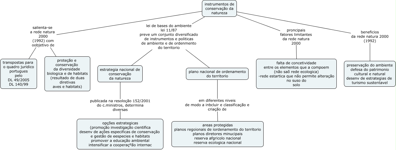 Esse mapa conceitual, produzido no IHMC CmapTools, tem a informação relacionada a: trab_5, instrumentos de conservação da natureza salienta-se a rede natura 2000 (1992) com oobjetivo de transpostas para o quadro juridico portugues pelo DL 49/2005 DL 140/99, instrumentos de conservação da natureza lei de bases do ambiente lei 11/87 preve um conjunto diversificado de instrumentos e politicas de ambiente e de ordenmento do territorio estrategia nacional de conservação da natureza, plano nacional de ordenamento do territorio em diferentes niveis de modo a inbcluir e classificação e criação de areas protegidas planos regoionais de iordenamento do territorio planos diretores minucipais reserva afgricolo nacional reserva ecologica nacional, estrategia nacional de conservação da natureza publicada na resoloção 152/2001 do c.ministros, determina diversas opções estrategicas (promoção investigação cientifica desenv de ações especificas de conservação e gestão de eespecies e habitats promover a educação ambiental intensificar a cooperaçºão internac, instrumentos de conservação da natureza proncipais fatores limitantes da rede natura 2000 falta de concetividade entre os elementos que a compoem (não saõ rede ecologica) -rede estartica que não permite alteração no suso do solo, instrumentos de conservação da natureza beneficios da rede natura 2000 (1992) preservação do ambiente defesa do patrimonio cultural e natural desenv de estrategias de turismo sustentavel, instrumentos de conservação da natureza lei de bases do ambiente lei 11/87 preve um conjunto diversificado de instrumentos e politicas de ambiente e de ordenmento do territorio plano nacional de ordenamento do territorio, instrumentos de conservação da natureza salienta-se a rede natura 2000 (1992) com oobjetivo de proteção e conservação da diversidade biologica e de habitats (resultado de duas diretivas aves e habitats)