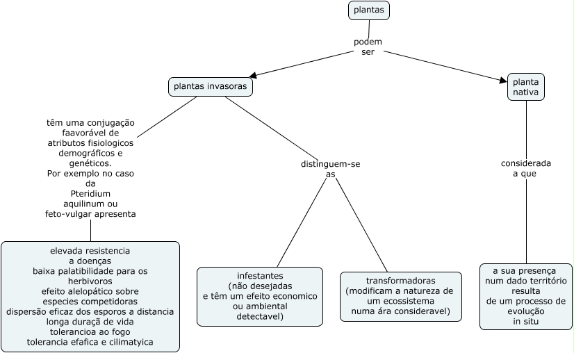 Esse mapa conceitual, produzido no IHMC CmapTools, tem a informação relacionada a: invasoras_6, plantas podem ser planta nativa, planta nativa considerada a que a sua presença num dado território resulta de um processo de evolução in situ, plantas invasoras distinguem-se as infestantes (não desejadas e têm um efeito economico ou ambiental detectavel), plantas podem ser plantas invasoras, plantas invasoras distinguem-se as transformadoras (modificam a natureza de um ecossistema numa ára consideravel), plantas invasoras têm uma conjugação faavorável de atributos fisiologicos demográficos e genéticos. Por exemplo no caso da Pteridium aquilinum ou feto-vulgar apresenta elevada resistencia a doenças baixa palatibilidade para os herbivoros efeito alelopático sobre especies competidoras dispersão eficaz dos esporos a distancia longa duraçã de vida tolerancioa ao fogo tolerancia efafica e cilimatyica