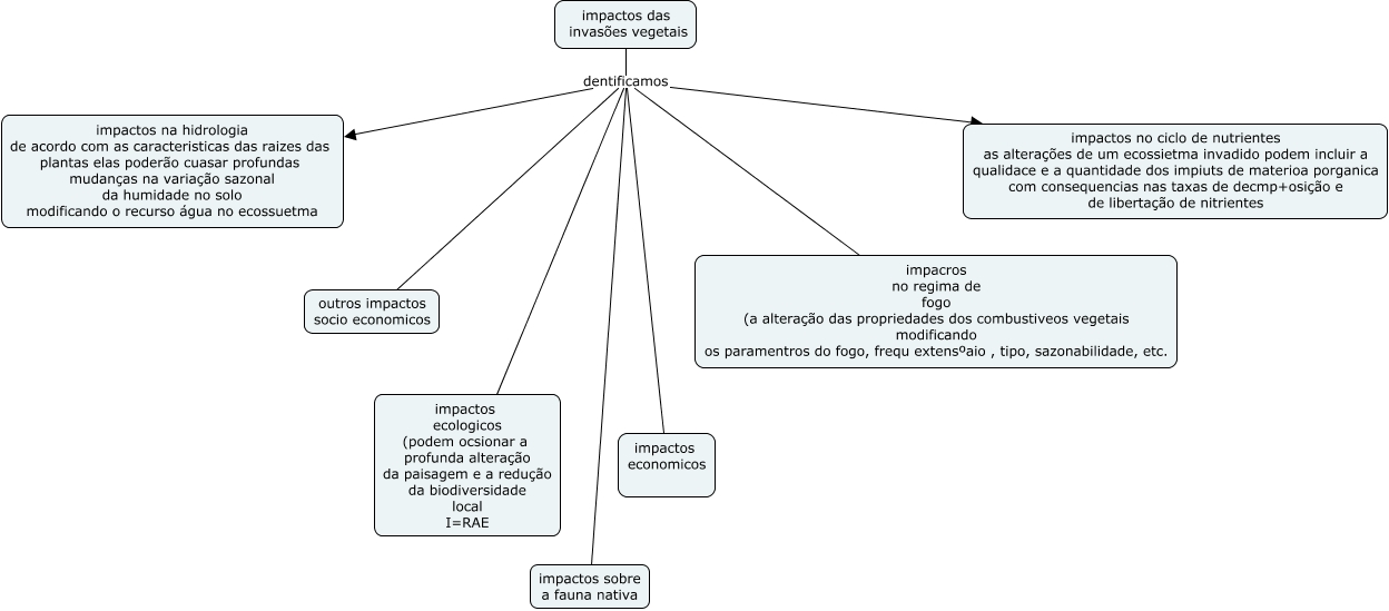 Esse mapa conceitual, produzido no IHMC CmapTools, tem a informação relacionada a: invasoras_8, impactos das invasões vegetais dentificamos impactos na hidrologia de acordo com as caracteristicas das raizes das plantas elas poderão cuasar profundas mudanças na variação sazonal da humidade no solo modificando o recurso água no ecossuetma, impactos das invasões vegetais dentificamos impactos economicos, impactos das invasões vegetais dentificamos impacros no regima de fogo (a alteração das propriedades dos combustiveos vegetais modificando os paramentros do fogo, frequ extensºaio , tipo, sazonabilidade, etc., impactos das invasões vegetais dentificamos impactos ecologicos (podem ocsionar a profunda alteração da paisagem e a redução da biodiversidade local I=RAE, impactos das invasões vegetais dentificamos impactos sobre a fauna nativa, impactos das invasões vegetais dentificamos outros impactos socio economicos, impactos das invasões vegetais dentificamos impactos no ciclo de nutrientes as alterações de um ecossietma invadido podem incluir a qualidace e a quantidade dos impiuts de materioa porganica com consequencias nas taxas de decmp+osição e de libertação de nitrientes