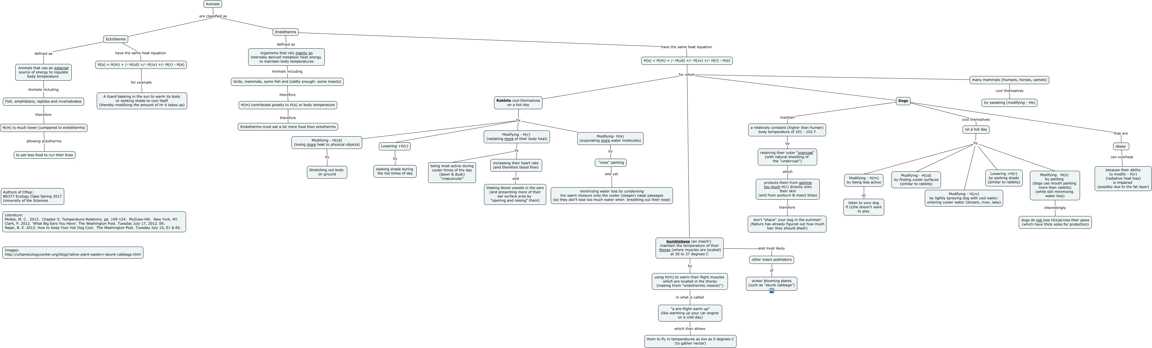 This Concept Map, created with IHMC CmapTools, has information related to: Ectotherms versus Endotherms, on a hot day by Modifying - H(m) by being less active, "a pre-flight warm up" (like warming up your car engine on a cold day) which then allows them to fly in temperatures as low as 0 degrees C (to gather nectar), Dogs maintain a relatively constant (higher than human) body temperature of 101 - 102 F, H(s) = H(m) + /- H(cd) +/- H(cv) +/- H(r) - H(e) for which Dogs, birds, mammals, some fish and (oddly enough: some insects) therefore H(m) contributes greatly to H(s) or body temperature, Modifying - H(m) by being less active so listen to your dog if (s)he doesn't want to play, Rabbits cool themselves on a hot day by Modifying- H(e) (evporating more water molecules), Dogs that are obese, organisms that rely mainly on internally derived metabolic heat energy to maintain body temperatures Animals including birds, mammals, some fish and (oddly enough: some insects), H(m) contributes greatly to H(s) or body temperature therefore Endotherms must eat a lot more food than ectotherms, bumblebees (an insect!) maintain the temperature of their thorax (where muscles are located) at 30 to 37 degrees C and most likely other insect pollinators, Animals that use an external source of energy to regulate body temperature Animals including Fish, amphibians, reptiles and invertebrates, Modifying - H(r) (radiating more of their body heat) by being most active during cooler times of the day (dawn & dusk) "crepuscular", H(m) is much lower (compared to endotherms) allowing ectotherms to eat less food to run their lives, Rabbits cool themselves on a hot day by Lowering +H(r), Dogs cool themselves on a hot day, on a hot day by Modifying - H(cv) by lightly spraying dog with cool water; entering cooler water (stream, river, lake), other insect pollinators of winter blooming plants (such as "skunk cabbage"), Modifying -H(e) by panting (dogs use mouth panting more than rabbits) (while still minimizing water loss) interestingly dogs do not lose H(e)across their paws (which have thick soles for protection), Ectotherms defined as Animals that use an external source of energy to regulate body temperature