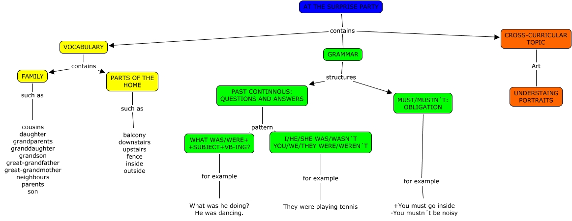 Este Cmap, tiene información relacionada con: AT THE SURPRISE PARTY Moisés, AT THE SURPRISE PARTY contains CROSS-CURRICULAR TOPIC, PAST CONTINNOUS: QUESTIONS AND ANSWERS pattern I/HE/SHE WAS/WASN´T YOU/WE/THEY WERE/WEREN´T, I/HE/SHE WAS/WASN´T YOU/WE/THEY WERE/WEREN´T for example They were playing tennis, MUST/MUSTN´T: OBLIGATION for example +You must go inside -You mustn´t be noisy, VOCABULARY contains FAMILY, AT THE SURPRISE PARTY contains GRAMMAR, AT THE SURPRISE PARTY contains VOCABULARY, VOCABULARY contains PARTS OF THE HOME, CROSS-CURRICULAR TOPIC Art UNDERSTAING PORTRAITS, FAMILY such as cousins daughter grandparents granddaughter grandson great-grandfather great-grandmother neighbours parents son, GRAMMAR structures MUST/MUSTN´T: OBLIGATION, WHAT WAS/WERE+ +SUBJECT+VB-ING? for example What was he doing? He was dancing., GRAMMAR structures PAST CONTINNOUS: QUESTIONS AND ANSWERS, PARTS OF THE HOME such as balcony downstairs upstairs fence inside outside, PAST CONTINNOUS: QUESTIONS AND ANSWERS pattern WHAT WAS/WERE+ +SUBJECT+VB-ING?