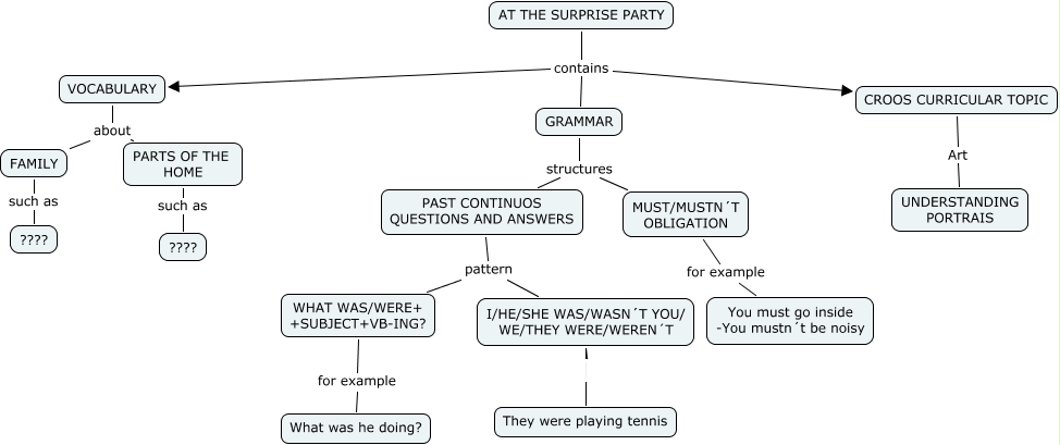 Este Cmap, tiene información relacionada con: AT THE SURPRISE-Antonio, PARTS OF THE HOME such as ????, GRAMMAR structures PAST CONTINUOS QUESTIONS AND ANSWERS, PAST CONTINUOS QUESTIONS AND ANSWERS pattern WHAT WAS/WERE+ +SUBJECT+VB-ING?, I/HE/SHE WAS/WASN´T YOU/ WE/THEY WERE/WEREN´T They were playing tennis, AT THE SURPRISE PARTY contains CROOS CURRICULAR TOPIC, MUST/MUSTN´T OBLIGATION for example You must go inside -You mustn´t be noisy, AT THE SURPRISE PARTY contains VOCABULARY, AT THE SURPRISE PARTY contains GRAMMAR, WHAT WAS/WERE+ +SUBJECT+VB-ING? for example What was he doing?, CROOS CURRICULAR TOPIC Art UNDERSTANDING PORTRAIS, I/HE/SHE WAS/WASN´T YOU/ WE/THEY WERE/WEREN´T They were playing tennis, VOCABULARY about FAMILY, GRAMMAR structures MUST/MUSTN´T OBLIGATION, PAST CONTINUOS QUESTIONS AND ANSWERS pattern I/HE/SHE WAS/WASN´T YOU/ WE/THEY WERE/WEREN´T, FAMILY such as ????, VOCABULARY about PARTS OF THE HOME