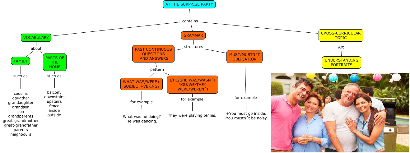 Este Cmap, tiene información relacionada con: AT THE SURPRISE-(Borja y Juan), AT THE SURPRISE PARTY contains CROSS-CURRICULAR TOPIC, FAMILY such as cousins daugther grandaughter grandson son grandparents great-grandmother great-grandfather parents neighbours, CROSS-CURRICULAR TOPIC Art UNDERSTANDING PORTRAITS, GRAMMAR structures PAST CONTINUOUS QUESTIONS AND ANSWERS, AT THE SURPRISE PARTY contains GRAMMAR, PAST CONTINUOUS QUESTIONS AND ANSWERS pattern I/HE/SHE WAS/WASN´T YOU/WE/THEY WERE/WEREN´T, MUST/MUSTN´T OBLIGATION for example +You must go inside. -You mustn´t be noisy., PAST CONTINUOUS QUESTIONS AND ANSWERS pattern WHAT WAS/WERE+ SUBJECT+VB-ING?, PARTS OF THE HOME such as balcony downstairs upstairs fence inside outside, AT THE SURPRISE PARTY contains VOCABULARY, VOCABULARY about PARTS OF THE HOME, I/HE/SHE WAS/WASN´T YOU/WE/THEY WERE/WEREN´T for example They were playing tennis., VOCABULARY about FAMILY, WHAT WAS/WERE+ SUBJECT+VB-ING? for example What was he doing? He was dancing., GRAMMAR structures MUST/MUSTN´T OBLIGATION