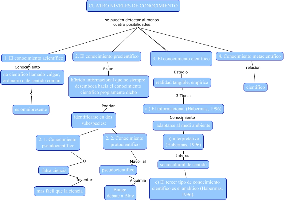 Este Cmap, tiene información relacionada con: EMPRESA MAPA, 2. 2. Conocimiento protocientífico Mayor al pseudocientifico, realidad tangible, empirica Estudio 3. El conocimiento científico, identificarse en dos subespecies: Podrian híbrido informacional que no siempre desemboca hacia el conocimiento científico propiamente dicho, 2. El conocimiento precientífico, híbrido informacional que no siempre desemboca hacia el conocimiento científico propiamente dicho Es un 2. El conocimiento precientífico, adaptarse al medi ambiente Conocimiento a ) El informacional (Habermas, 1996), identificarse en dos subespecies: ???? 2. 2. Conocimiento protocientífico, 2. 1. Conocimiento pseudocientífico O falsa ciencia, identificarse en dos subespecies: ???? 2. 1. Conocimiento pseudocientífico, pseudocientifico Alquimia Bunge debate a Blitz, no científico llamado vulgar, ordinario o de sentido común. Y es omnipresente, 2. El conocimiento precientífico 1. El conocimiento acientífico, sociocultural de sentido ???? c) El tercer tipo de conocimiento científico es el analítico (Habermas, 1996)., 4. Conocimiento metacientífico, CUATRO NIVELES DE CONOCIMIENTO se pueden detectar al menos cuatro posibilidades: ????, falsa ciencia Inventar mas facil que la ciencia, cientifico relacion 4. Conocimiento metacientífico, b) interpretativo (Habermas, 1996) Interes sociocultural de sentido, 1. El conocimiento acientífico Conocimiento no científico llamado vulgar, ordinario o de sentido común., 4. Conocimiento metacientífico 1. El conocimiento acientífico