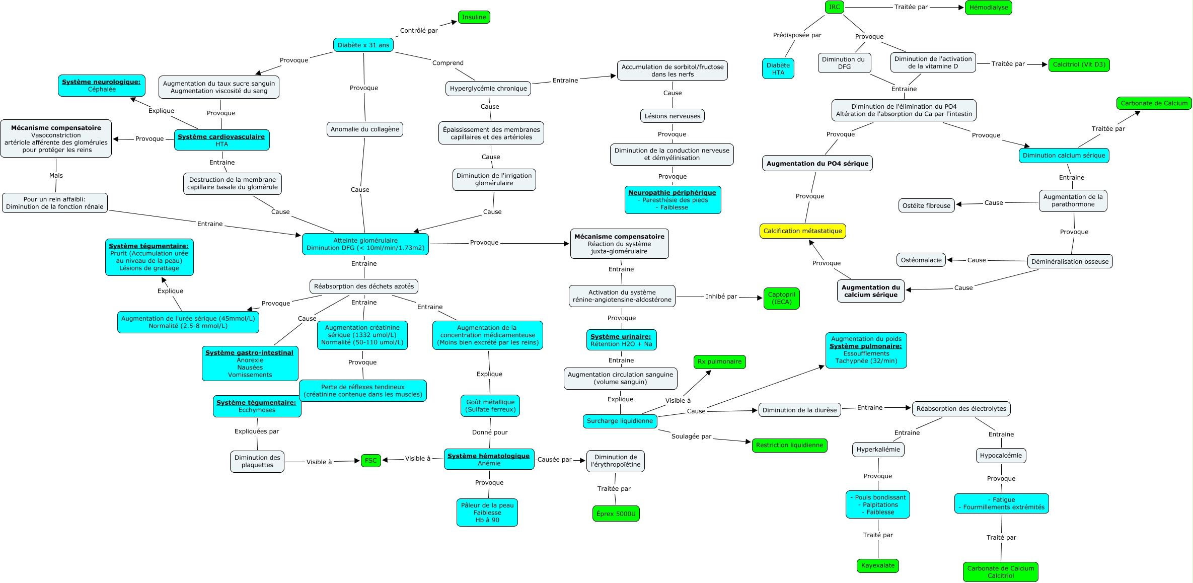Cette carte de concepts créée avec IHMC CmapTools traite de: IRC_IRA, Augmentation du calcium sérique Provoque Calcification métastatique, Augmentation de la concentration médicamenteuse (Moins bien excrété par les reins) Explique Goût métallique (Sulfate ferreux), Diminution de l'irrigation glomérulaire Cause Atteinte glomérulaire Diminution DFG (< 10ml/min/1.73m2), Diminution de la conduction nerveuse et démyélinisation Provoque Neuropathie périphérique - Paresthésie des pieds - Faiblesse, Diminution de la diurèse Entraine Réabsorption des électrolytes, Hyperglycémie chronique Entraine Accumulation de sorbitol/fructose dans les nerfs, IRC Prédisposée par Diabète HTA, Diabète x 31 ans Contrôlé par Insuline, Diminution de l'activation de la vitamine D Entraine Diminution de l'élimination du PO4 Altération de l'absorption du Ca par l'intestin, Diminution de l'élimination du PO4 Altération de l'absorption du Ca par l'intestin Provoque Diminution calcium sérique, Mécanisme compensatoire Réaction du système juxta-glomérulaire Entraine Activation du système rénine-angiotensine-aldostérone, Goût métallique (Sulfate ferreux) Donné pour Système hématologique Anémie, Anomalie du collagène Cause Atteinte glomérulaire Diminution DFG (< 10ml/min/1.73m2), Pour un rein affaibli: Diminution de la fonction rénale Entraine Atteinte glomérulaire Diminution DFG (< 10ml/min/1.73m2), Activation du système rénine-angiotensine-aldostérone Inhibé par Captopril (IECA), Augmentation de l'urée sérique (45mmol/L) Normalité (2.5-8 mmol/L) Explique Système tégumentaire: Prurit (Accumulation urée au niveau de la peau) Lésions de grattage, Surcharge liquidienne Visible à Rx pulmonaire, Atteinte glomérulaire Diminution DFG (< 10ml/min/1.73m2) Provoque Mécanisme compensatoire Réaction du système juxta-glomérulaire, Réabsorption des déchets azotés Provoque Augmentation de l'urée sérique (45mmol/L) Normalité (2.5-8 mmol/L), Augmentation du PO4 sérique Provoque Calcification métastatique