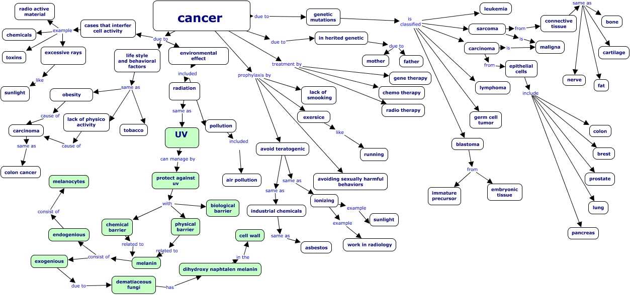 This Concept Map, created with IHMC CmapTools, has information related to: CONTRATO TRABAJO, blastoma from immature precursor, epithelial cells include prostate, connective tissue same as fat, cancer prophylaxis by lack of smooking, cancer due to in herited genetic, life style and behavioral factors same as tobacco, genetic mutations is classified germ cell tumor, carcinoma same as colon cancer, cases that interfer cell activity example excessive rays, dematiaceous fungi has dihydroxy naphtalen melanin, industrial chemicals same as asbestos, carcinoma from epithelial cells, lack of physico activity cause of carcinoma, endogenious consist of melanocytes, physical barrier related to melanin, cancer prophylaxis by exersice, cancer treatment by gene therapy, melanin consist of endogenious, genetic mutations is classified carcinoma, chemical barrier related to melanin