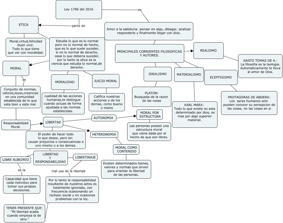 Este Cmap, tiene información relacionada con: ley 1796 2016, PRINCIPALES CORRIENTES FILOSOFICAS Y AUTORES. ???? ECEPTISISMO, LIBERTAD ???? HETERONOMIA, Ley 1796 del 2016 es Amor a la sabiduria: pensar en algo, dibagar, analizar responderle y finalmente llegar con dios., LIBRE ALBEDRIO ???? LIBERTAD Y RESPONSABILIDAD, PRINCIPALES CORRIENTES FILOSOFICAS Y AUTORES. ???? MATERIALISMO, Ley 1796 del 2016 parte de ETICA, LIBERTINAJE ???? LIBERTAD Y RESPONSABILIDAD, HETERONOMIA ???? MORAL COMO CONTENIDO, ETICA ???? Estudia lo que es lo normal pero no lo normal de hecho, que es lo que suele suceder, si no lo normal de derecho, osea lo que deberia suceder, por lo tanto la etica es la ciencia que estudia lo normal,de derecho., Capacidad que tiene cada individuo para tomar sus propias decisiones. ???? TENER PRESENTE QUE: "Mi libertad acaba cuando empieza la de otro.", AUTONOMIA ???? MORAL POR ESTRUCTURA, MORAL ???? Responsabilidad Moral., REALISMO ???? SANTO TOMAS DE A.: La filosofia es la teologia. Automaticamente te lleva al amor de Dios., MORAL COMO CONTENIDO ???? Existen determinados bienes, valores y normas que sirven para orientar la libertad de las personas., Responsabilidad Moral. ???? LIBERTAD, LIBERTINAJE mal uso de la libertad Por lo tanto la responsabilidad resultante de nuestros actos es totalmente ignorada, con frecuencia ocasionando un rechazo social y en ocasiones problemas con la ley., PRINCIPALES CORRIENTES FILOSOFICAS Y AUTORES. ???? IDEALISMO, Califica nuestras acciones y de los demas, como bueno o malos ???? JUICIO MORAL, LIBERTAD es El poder de hacer todo lo que desee, pero sin causar prejuicios o consecuencias a uno mismo o a los demas., Estudia lo que es lo normal pero no lo normal de hecho, que es lo que suele suceder, si no lo normal de derecho, osea lo que deberia suceder, por lo tanto la etica es la ciencia que estudia lo normal,de derecho. ???? MORALIDAD