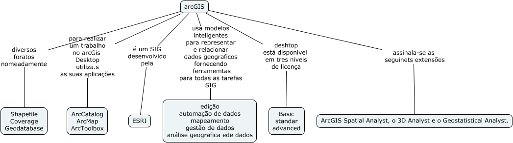 Esse mapa conceitual, produzido no IHMC CmapTools, tem a informação relacionada a: Análise comparativa_proprietario, arcGIS para realizar um trabalho no arcGis Desktop utiliza.s as suas aplicações ArcCatalog ArcMap ArcToolbox, arcGIS assinala-se as seguinets extensões ArcGIS Spatial Analyst, o 3D Analyst e o Geostatistical Analyst., arcGIS deshtop está disponivel em tres niveis de licença Basic standar advanced, arcGIS diversos foratos nomeadamente Shapefile Coverage Geodatabase, arcGIS usa modelos inteligentes para representar e relacionar dados geograficos fornecendo ferramemtas para todas as tarefas SIG edição automação de dados mapeamento gestão de dados análise geografica ede dados, arcGIS é um SIG desenvolvido pela ESRI