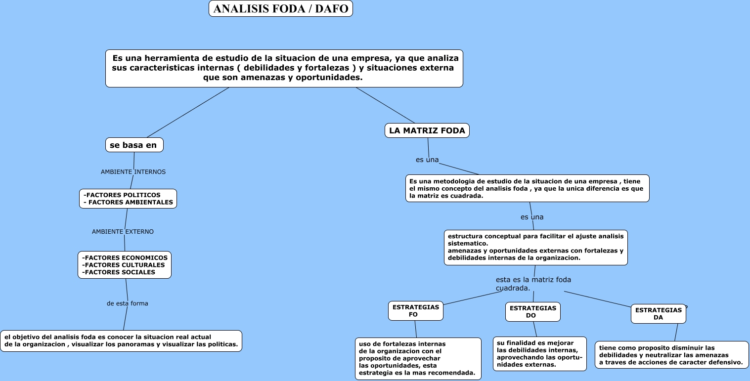 Este Cmap, tiene información relacionada con: Lo escrito permanece, ESTRATEGIAS FO ???? uso de fortalezas internas de la organizacion con el proposito de aprovechar las oportunidades, esta estrategia es la mas recomendada., Es una metodologia de estudio de la situacion de una empresa , tiene el mismo concepto del analisis foda , ya que la unica diferencia es que la matriz es cuadrada. es una estructura conceptual para facilitar el ajuste analisis sistematico. amenazas y oportunidades externas con fortalezas y debilidades internas de la organizacion., LA MATRIZ FODA ???? Es una herramienta de estudio de la situacion de una empresa, ya que analiza sus caracteristicas internas ( debilidades y fortalezas ) y situaciones externa que son amenazas y oportunidades., se basa en AMBIENTE INTERNOS -FACTORES POLITICOS - FACTORES AMBIENTALES, ESTRATEGIAS DO ???? su finalidad es mejorar las debilidades internas, aprovechando las oportu- nidades externas., estructura conceptual para facilitar el ajuste analisis sistematico. amenazas y oportunidades externas con fortalezas y debilidades internas de la organizacion. esta es la matriz foda cuadrada. ESTRATEGIAS DA, LA MATRIZ FODA es una Es una metodologia de estudio de la situacion de una empresa , tiene el mismo concepto del analisis foda , ya que la unica diferencia es que la matriz es cuadrada., ESTRATEGIAS DA ???? tiene como proposito disminuir las debilidades y neutralizar las amenazas a traves de acciones de caracter defensivo., -FACTORES POLITICOS - FACTORES AMBIENTALES AMBIENTE EXTERNO -FACTORES ECONOMICOS -FACTORES CULTURALES -FACTORES SOCIALES, se basa en ???? ????, -FACTORES ECONOMICOS -FACTORES CULTURALES -FACTORES SOCIALES de esta forma el objetivo del analisis foda es conocer la situacion real actual de la organizacion , visualizar los panoramas y visualizar las politicas., estructura conceptual para facilitar el ajuste analisis sistematico. amenazas y oportunidades externas con fortalezas y debilidades internas de la organizacion. esta es la matriz foda cuadrada. ESTRATEGIAS DO, estructura conceptual para facilitar el ajuste analisis sistematico. amenazas y oportunidades externas con fortalezas y debilidades internas de la organizacion. esta es la matriz foda cuadrada. ESTRATEGIAS FO