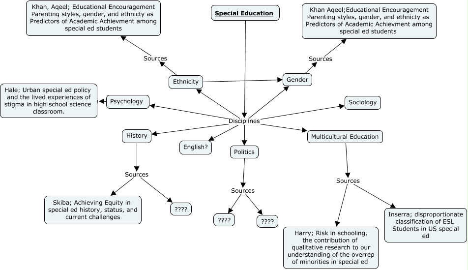 This Concept Map, created with IHMC CmapTools, has information related to: Mountain Disciplines, Gender Sources Khan Aqeel;Educational Encouragement Parenting styles, gender, and ethnicty as Predictors of Academic Achievment among special ed students, Politics Sources ????, Politics Sources ????, Special Education Disciplines History, Special Education Disciplines Politics, Special Education Disciplines English?, Special Education Disciplines Gender, Special Education Disciplines Multicultural Education, History Sources Skiba; Achieving Equity in special ed history, status, and current challenges, Psychology Source Hale; Urban special ed policy and the lived experiences of stigma in high school science classroom., Special Education Disciplines Psychology, Special Education Disciplines Ethnicity, Ethnicity Sources Khan, Aqeel; Educational Encouragement Parenting styles, gender, and ethnicty as Predictors of Academic Achievment among special ed students, Ethnicity Gender, Multicultural Education Sources Harry; Risk in schooling, the contribution of qualitative research to our understanding of the overrep of minorities in special ed, Multicultural Education Sources Inserra; disproportionate classification of ESL Students in US special ed, Special Education Disciplines Sociology, History Sources ????
