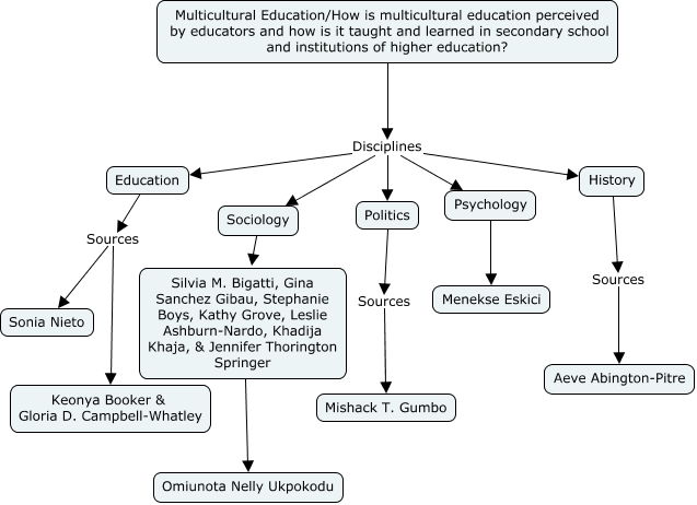 This Concept Map, created with IHMC CmapTools, has information related to: 389_Talluto Disciplines, Multicultural Education/How is multicultural education perceived by educators and how is it taught and learned in secondary school and institutions of higher education? Disciplines Politics, Politics Sources Mishack T. Gumbo, Education Sources Sonia Nieto, Sociology ???? Silvia M. Bigatti, Gina Sanchez Gibau, Stephanie Boys, Kathy Grove, Leslie Ashburn-Nardo, Khadija Khaja, & Jennifer Thorington Springer, Psychology Menekse Eskici, Multicultural Education/How is multicultural education perceived by educators and how is it taught and learned in secondary school and institutions of higher education? Disciplines Sociology, Multicultural Education/How is multicultural education perceived by educators and how is it taught and learned in secondary school and institutions of higher education? Disciplines Education, Multicultural Education/How is multicultural education perceived by educators and how is it taught and learned in secondary school and institutions of higher education? Disciplines History, History Sources Aeve Abington-Pitre, Silvia M. Bigatti, Gina Sanchez Gibau, Stephanie Boys, Kathy Grove, Leslie Ashburn-Nardo, Khadija Khaja, & Jennifer Thorington Springer Omiunota Nelly Ukpokodu, Multicultural Education/How is multicultural education perceived by educators and how is it taught and learned in secondary school and institutions of higher education? Disciplines Psychology, Education Sources Keonya Booker & Gloria D. Campbell-Whatley