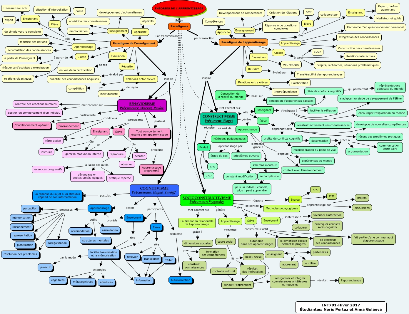 This Concept Map, created with IHMC CmapTools, has information related to: Théories de l'apprentisage, Élève ???? collaborateur, Enseignant s'intéresse à provoquer conflicts socio-cognitifs, Apprentissage processus représentation, La dimention relationalle de l'apprentissage grâce à dimensions sociales, profite de conflicts cognitifs décentration, Paradigme de l'enseignment ???? Approche, dimensions sociales pour formation des compétences, facilite l'assimilation et la mémorisation par le mode proactif, Approche ???? objectifs, offrir de conflicts cognitifs qui permettent réprésentations adéquats du monde, traiter information, Réussite évalué par quantité des connaissances adquises, Élève rôle recevoir, Élève apprenant actif développe de nouvelles compétences, Paradigme de l'enseignment Enseignement memorisation, Apprentissage processus raisonnement, Paradigme de l'apprentissage ???? Rélations entre élèves, Paradigme de l'enseignment Enseignement aquisition des connaissances, Paradigmes par transaction Paradigme de l'apprentissage, CONSTRUCTIVISME Précurseur: Piaget génère Apprentissage