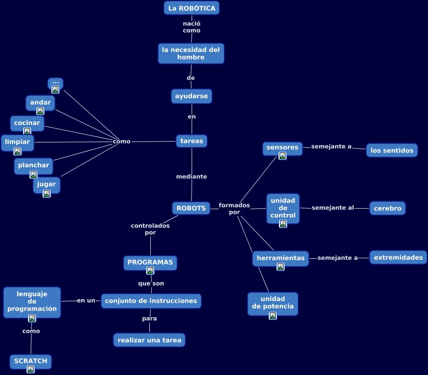 Este Cmap, tiene información relacionada con: Los robots, herramientas semejante a extremidades, tareas como jugar, conjunto de instrucciones en un lenguaje de programación, ROBOTS formados por unidad de control, ROBOTS formados por sensores, ayudarse en tareas, tareas como limpiar, tareas como cocinar, sensores semejante a los sentidos, conjunto de instrucciones para realizar una tarea, ROBOTS controlados por PROGRAMAS, PROGRAMAS que son conjunto de instrucciones, unidad de control semejante al cerebro, tareas como ..., lenguaje de programación como SCRATCH, ROBOTS formados por unidad de potencia, tareas mediante ROBOTS, tareas como andar, La ROBÓTICA nació como la necesidad del hombre, la necesidad del hombre de ayudarse