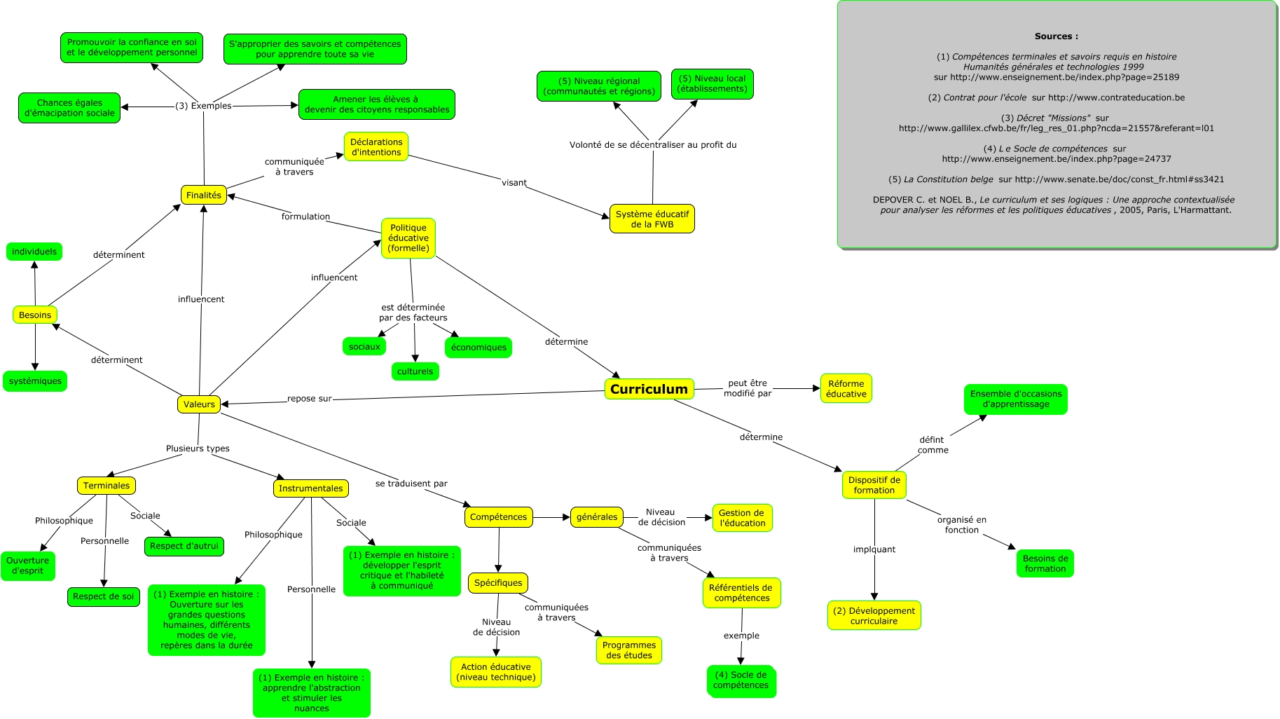 Cette carte de concepts créée avec IHMC CmapTools traite de: curricula-tp1-essai2, Système éducatif de la FWB Volonté de se décentraliser au profit du (5) Niveau local (établissements), Politique éducative (formelle) est déterminée par des facteurs culturels, Référentiels de compétences exemple (4) Socle de compétences, générales Niveau de décision Gestion de l'éducation, Politique éducative (formelle) détermine Curriculum, Finalités communiquée à travers Déclarations d'intentions, Politique éducative (formelle) est déterminée par des facteurs économiques, Valeurs influencent Politique éducative (formelle), Instrumentales Personnelle (1) Exemple en histoire : apprendre l'abstraction et stimuler les nuances, Spécifiques Niveau de décision Action éducative (niveau technique), Finalités (3) Exemples Promouvoir la confiance en soi et le développement personnel, Besoins individuels, Dispositif de formation défint comme Ensemble d'occasions d'apprentissage, Compétences générales, Dispositif de formation organisé en fonction Besoins de formation, Système éducatif de la FWB Volonté de se décentraliser au profit du (5) Niveau régional (communautés et régions), Terminales Personnelle Respect de soi, Politique éducative (formelle) est déterminée par des facteurs sociaux, Curriculum détermine Dispositif de formation, Valeurs influencent Finalités