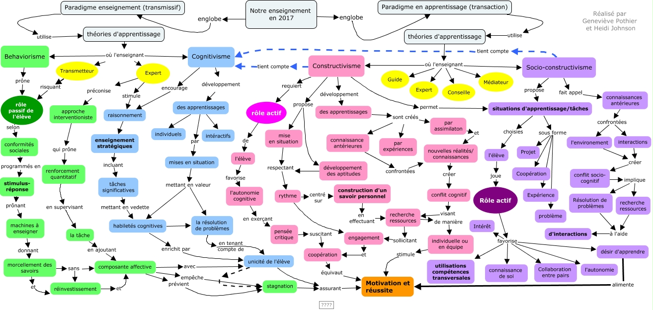 This Concept Map, created with IHMC CmapTools, has information related to: Johson_Pothier19mars, rythme engagement, morcellement des savoirs sans réinvestissement, Rôle actif favorise l'autonomie, situations d'apprentissage/tâches sous forme problème, l'environement créer conflit socio- cognitif, connaissances antérieures confrontées interactions, composante affective prévient stagnation, théories d'apprentissage où l'enseignant Expert, recherche ressources sollicitant engagement, pensée critique suscitant coopération, des apprentissages intéractifs, Notre enseignement en 2017 englobe Paradigme en apprentissage (transaction), situations d'apprentissage/tâches choisies l'élève, composante affective avec unicité de l'élève, mise en situation respectant rythme, conformités sociales programmés en stimulus- réponse, nouvelles réalités/ connaissances créer conflit cognitif, Socio-constructivisme propose situations d'apprentissage/tâches, situations d'apprentissage/tâches sous forme Coopération, recherche ressources à l'aide d'interactions