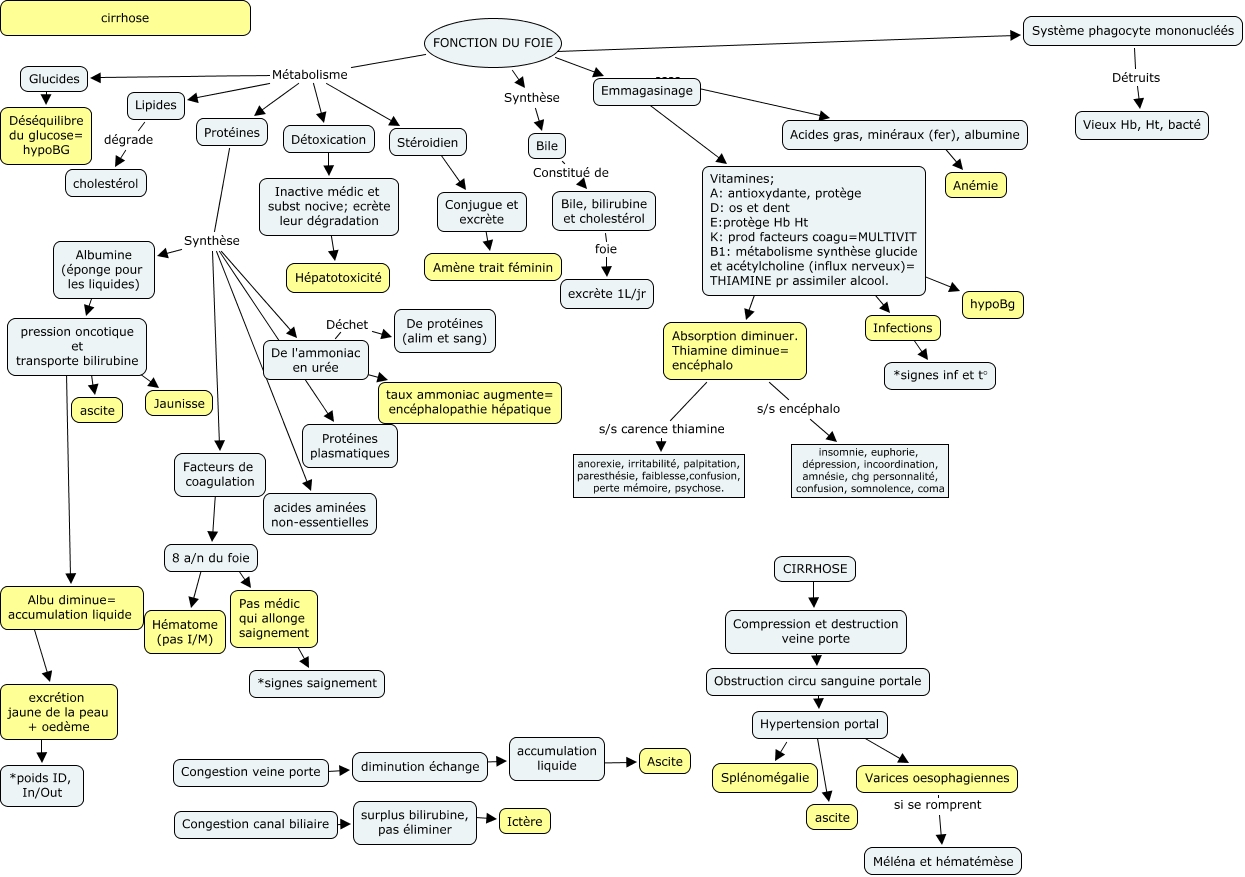 Cette carte de concepts créée avec IHMC CmapTools traite de: cirrhose, surplus bilirubine, pas éliminer ???? Ictère, Hypertension portal ???? ascite, Albu diminue= accumulation liquide ???? excrétion jaune de la peau + oedème, Absorption diminuer. Thiamine diminue= encéphalo s/s encéphalo insomnie, euphorie, dépression, incoordination, amnésie, chg personnalité, confusion, somnolence, coma, diminution échange ???? accumulation liquide, Conjugue et excrète ???? Amène trait féminin, Acides gras, minéraux (fer), albumine ???? Anémie, De l'ammoniac en urée ???? taux ammoniac augmente= encéphalopathie hépatique, Inactive médic et subst nocive; ecrète leur dégradation ???? Hépatotoxicité, Protéines Synthèse De l'ammoniac en urée, Pas médic qui allonge saignement ???? *signes saignement, Système phagocyte mononucléés Détruits Vieux Hb, Ht, bacté, FONCTION DU FOIE Métabolisme Protéines, Lipides dégrade cholestérol, Varices oesophagiennes si se romprent Méléna et hématémèse, Hypertension portal ???? Splénomégalie, accumulation liquide ???? Ascite, Congestion veine porte ???? diminution échange, CIRRHOSE ???? Compression et destruction veine porte, Infections ???? *signes inf et t°