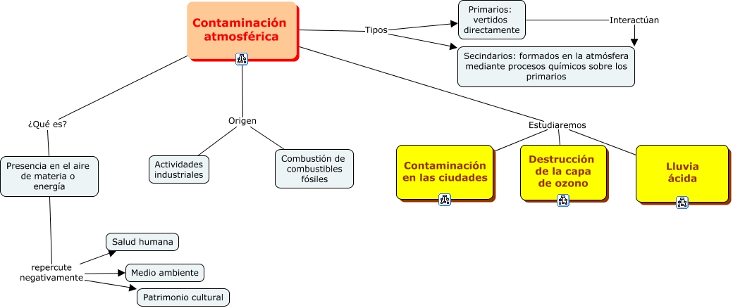 Este Cmap, tiene información relacionada con: 1.3 Contaminación atmosférica, Contaminación atmosférica ¿Qué es? Presencia en el aire de materia o energía, Presencia en el aire de materia o energía repercute negativamente Salud humana, Contaminación atmosférica Tipos Primarios: vertidos directamente, Contaminación atmosférica Tipos Secindarios: formados en la atmósfera mediante procesos químicos sobre los primarios, Contaminación atmosférica Estudiaremos Lluvia ácida, Contaminación atmosférica Estudiaremos Contaminación en las ciudades, Contaminación atmosférica Estudiaremos Destrucción de la capa de ozono, Contaminación atmosférica Origen Combustión de combustibles fósiles, Contaminación atmosférica Origen Actividades industriales, Primarios: vertidos directamente Interactúan Secindarios: formados en la atmósfera mediante procesos químicos sobre los primarios, Presencia en el aire de materia o energía repercute negativamente Patrimonio cultural, Presencia en el aire de materia o energía repercute negativamente Medio ambiente