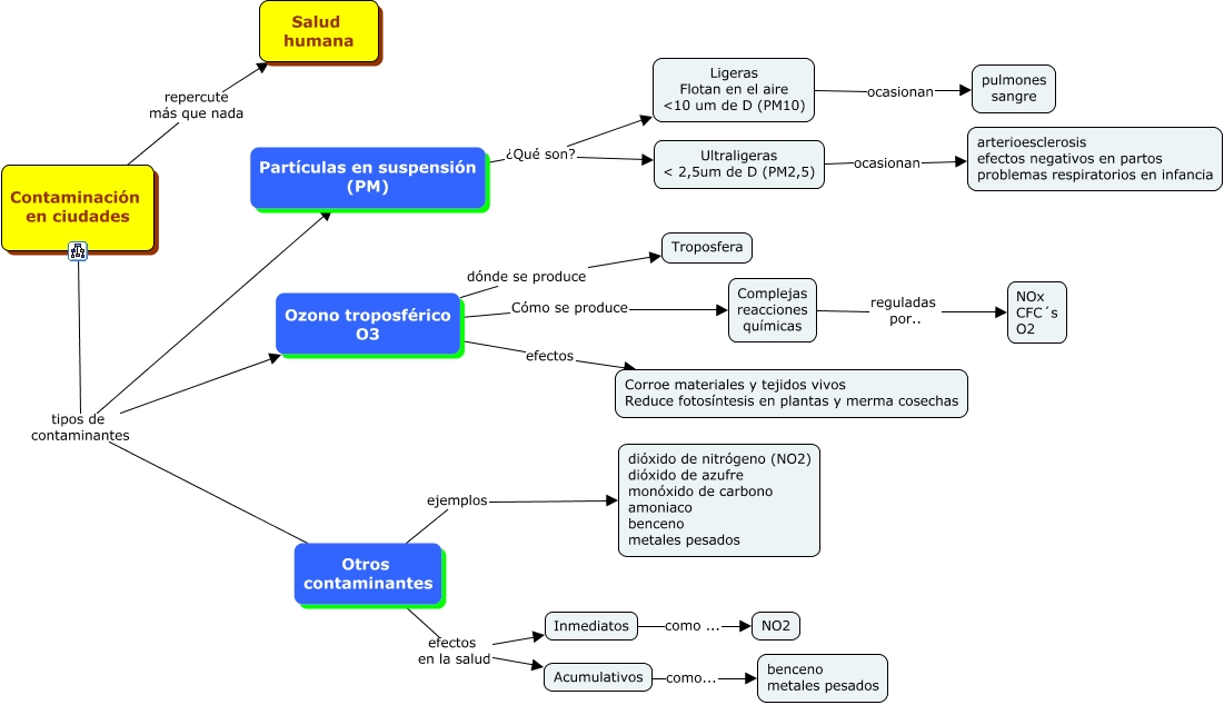 Este Cmap, tiene información relacionada con: 1.3.1 Contaminación en ciudades, Contaminación en ciudades tipos de contaminantes Partículas en suspensión (PM), Otros contaminantes efectos en la salud Acumulativos, Contaminación en ciudades tipos de contaminantes Ozono troposférico O3, Otros contaminantes efectos en la salud Inmediatos, Otros contaminantes ejemplos dióxido de nitrógeno (NO2) dióxido de azufre monóxido de carbono amoniaco benceno metales pesados, Ozono troposférico O3 Cómo se produce Complejas reacciones químicas, Partículas en suspensión (PM) ¿Qué son? Ultraligeras < 2,5um de D (PM2,5), Ozono troposférico O3 efectos Corroe materiales y tejidos vivos Reduce fotosíntesis en plantas y merma cosechas, Complejas reacciones químicas reguladas por.. NOx CFC´s O2, Ligeras Flotan en el aire um de D (PM10) ocasionan pulmones sangre, Contaminación en ciudades repercute más que nada Salud humana, Partículas en suspensión (PM) ¿Qué son? Ligeras Flotan en el aire um de D (PM10), Contaminación en ciudades tipos de contaminantes Otros contaminantes, Ozono troposférico O3 dónde se produce Troposfera, Acumulativos como... benceno metales pesados, Inmediatos como ... NO2, Ultraligeras < 2,5um de D (PM2,5) ocasionan arterioesclerosis efectos negativos en partos problemas respiratorios en infancia
