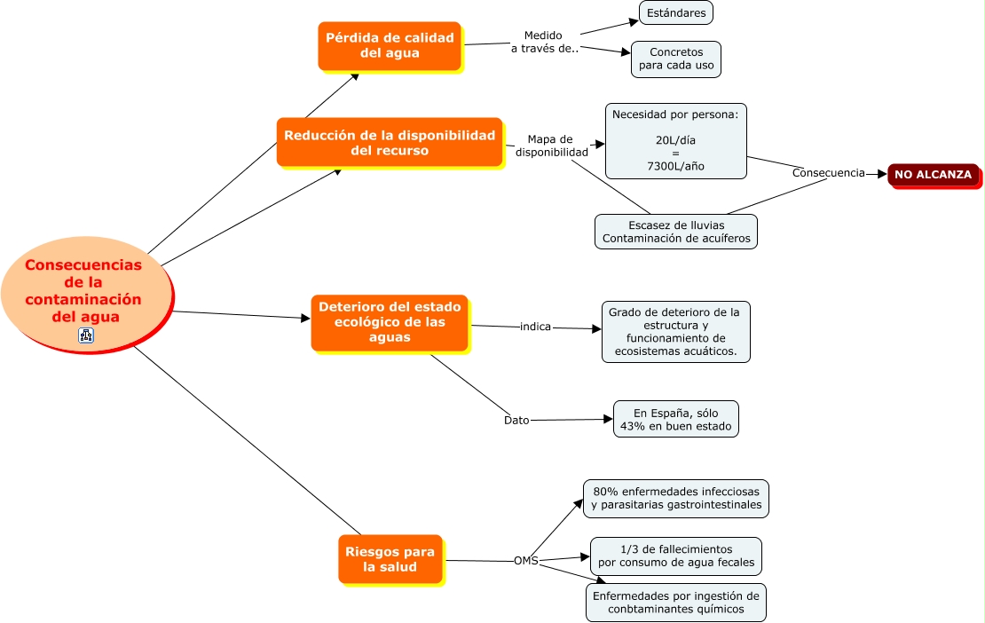 Este Cmap, tiene información relacionada con: 1.2.1 Consecuencias contaminación aguas, Reducción de la disponibilidad del recurso Mapa de disponibilidad Necesidad por persona: 20L/día = 7300L/año, Pérdida de calidad del agua Medido a través de.. Estándares, Deterioro del estado ecológico de las aguas Dato En España, sólo 43% en buen estado, Riesgos para la salud OMS 80% enfermedades infecciosas y parasitarias gastrointestinales, Deterioro del estado ecológico de las aguas indica Grado de deterioro de la estructura y funcionamiento de ecosistemas acuáticos., Necesidad por persona: 20L/día = 7300L/año Consecuencia NO ALCANZA, Consecuencias de la contaminación del agua ???? Deterioro del estado ecológico de las aguas, Consecuencias de la contaminación del agua ???? Riesgos para la salud, Consecuencias de la contaminación del agua ???? Reducción de la disponibilidad del recurso, Consecuencias de la contaminación del agua ???? Pérdida de calidad del agua, Reducción de la disponibilidad del recurso Mapa de disponibilidad Escasez de lluvias Contaminación de acuíferos, Riesgos para la salud OMS Enfermedades por ingestión de conbtaminantes químicos, Pérdida de calidad del agua Medido a través de.. Concretos para cada uso, Riesgos para la salud OMS 1/3 de fallecimientos por consumo de agua fecales, Escasez de lluvias Contaminación de acuíferos Consecuencia NO ALCANZA
