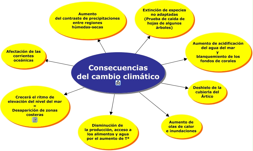 Este Cmap, tiene información relacionada con: 4.1 Consecuencias del cambio climático, Consecuencias del cambio climático ???? Disminución de la producción, acceso a los alimentos y agua por el aumento de Tª, Consecuencias del cambio climático ???? Crecerá el ritmo de elevación del nivel del mar = Desaparición de zonas costeras, Consecuencias del cambio climático ???? Aumento de olas de calor e inundaciones, Consecuencias del cambio climático ???? Deshielo de la cubierla del Ártico, Consecuencias del cambio climático ???? Afectación de las corrientes oceánicas, Consecuencias del cambio climático ???? Aumento de acidificación del agua del mar y blanquemiento de los fondos de corales, Consecuencias del cambio climático ???? Extinción de especies no adaptadas (Prueba de caida de hojas de algunos árboles), Consecuencias del cambio climático ???? Aumento del contraste de precipitaciones entre regiones húmedas-secas