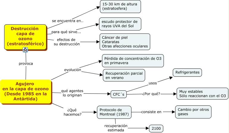 Este Cmap, tiene información relacionada con: 1.3.2 Destrucción capa de ozono, Destrucción capa de ozono (estratosférico) se encuentra en.. 15-30 km de altura (estratosfera), Agujero en la capa de ozono (Desde 1985 en la Antártida) ¿Qué hacemos? Protocolo de Montreal (1987), CFC´s ¿Por qué? Muy estables Sólo reaccionan con el O3, Destrucción capa de ozono (estratosférico) provoca Agujero en la capa de ozono (Desde 1985 en la Antártida), Agujero en la capa de ozono (Desde 1985 en la Antártida) evolución Pérdida de concentración de O3 en primavera, Destrucción capa de ozono (estratosférico) para qué sirve... escudo protector de rayos UVA del Sol, Protocolo de Montreal (1987) consiste en Cambio por otros gases, Protocolo de Montreal (1987) recuperación estimada 2100, CFC´s usos Refrigerantes, Destrucción capa de ozono (estratosférico) efectos de su destrucción Cáncer de piel Cataratas Otras afecciones oculares, Agujero en la capa de ozono (Desde 1985 en la Antártida) evolución Recuperación parcial en verano, Agujero en la capa de ozono (Desde 1985 en la Antártida) qué agentes lo originan CFC´s