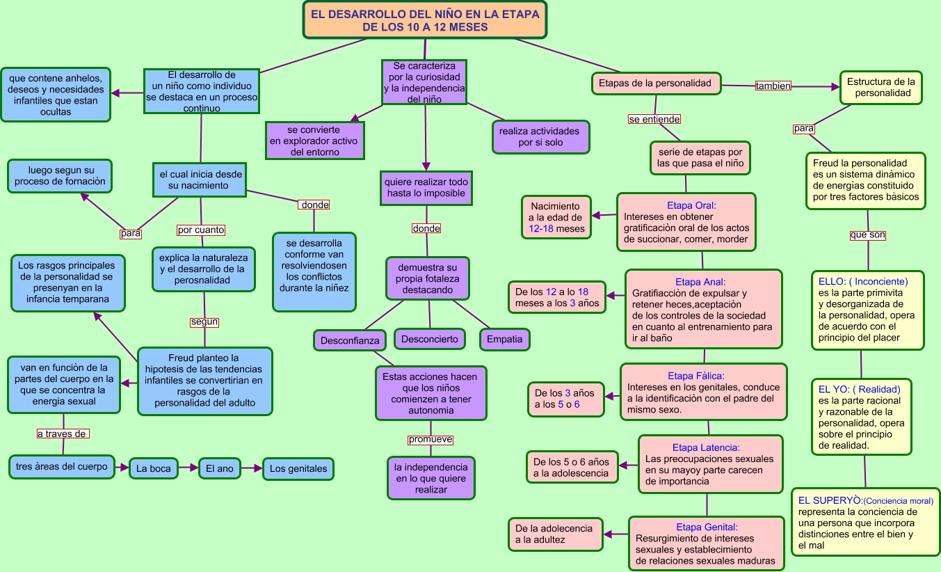 Este Cmap, tiene información relacionada con: DESARROLLO EN LOS NIÑOS, EL DESARROLLO DEL NIÑO EN LA ETAPA DE LOS 10 A 12 MESES Se caracteriza por la curiosidad y la independencia del niño se convierte en explorador activo del entorno, Estas acciones hacen que los niños comienzen a tener autonomia promueve la independencia en lo que quiere realizar, demuestra su propia fotaleza destacando ???? Desconfianza, el cual inicia desde su nacimiento para luego segun su proceso de fornaciòn, demuestra su propia fotaleza destacando ???? Empatia, Etapa Fàlica: Intereses en los genitales, conduce a la identificaciòn con el padre del mismo sexo. ???? De los 3 años a los 5 o 6, Desconfianza ???? Estas acciones hacen que los niños comienzen a tener autonomia, Etapa Anal: Gratifiacciòn de expulsar y retener heces,aceptaciòn de los controles de la sociedad en cuanto al entrenamiento para ir al baño ???? Etapa Fàlica: Intereses en los genitales, conduce a la identificaciòn con el padre del mismo sexo., ELLO: ( Inconciente) es la parte primivita y desorganizada de la personalidad, opera de acuerdo con el principio del placer ???? EL YO: ( Realidad) es la parte racional y razonable de la personalidad, opera sobre el principio de realidad., tres àreas del cuerpo ???? La boca, Freud planteo la hipotesis de las tendencias infantiles se convertirian en rasgos de la personalidad del adulto ???? Los rasgos principales de la personalidad se presenyan en la infancia temparana, Etapa Genital: Resurgimiento de intereses sexuales y establecimiento de relaciones sexuales maduras ???? De la adolecencia a la adultez, van en funciòn de la partes del cuerpo en la que se concentra la energia sexual a traves de tres àreas del cuerpo, La boca ???? El ano, Freud la personalidad es un sistema dinàmico de energìas constituido por tres factores bàsicos que son ELLO: ( Inconciente) es la parte primivita y desorganizada de la personalidad, opera de acuerdo con el principio del placer, demuestra su propia fotaleza destacando ???? Desconcierto, EL DESARROLLO DEL NIÑO EN LA ETAPA DE LOS 10 A 12 MESES El desarrollo de un niño como individuo se destaca en un proceso continuo el cual inicia desde su nacimiento, Etapa Oral: Intereses en obtener gratificaciòn oral de los actos de succionar, comer, morder inicia Nacimiento a la edad de 12-18 meses, explica la naturaleza y el desarrollo de la perosnalidad segun Freud planteo la hipotesis de las tendencias infantiles se convertirian en rasgos de la personalidad del adulto, serie de etapas por las que pasa el niño ???? Etapa Oral: Intereses en obtener gratificaciòn oral de los actos de succionar, comer, morder