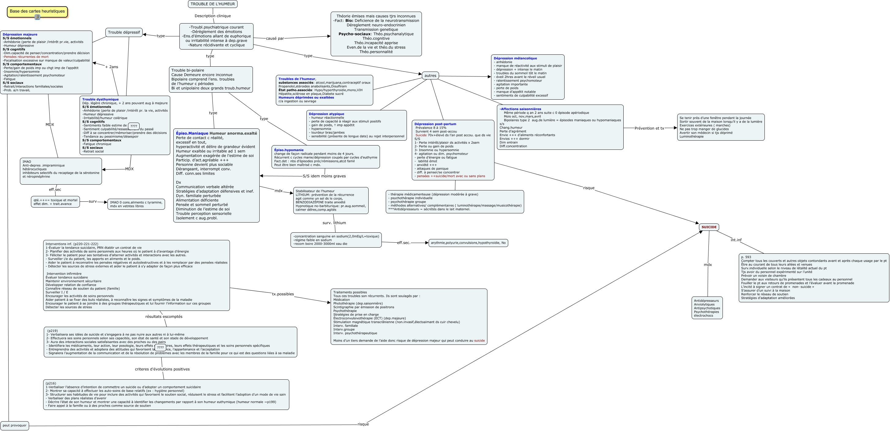 Cette carte de concepts créée avec IHMC CmapTools traite de: trouble de l'humeur, ???? MDX IMAO Anti-depres .imipraminique hétérocycliques inhibiteurs selectifs du recaptage de la sérotonine et néropinéphrine, Dépression post-partum Prévalence 8 à 15% Survient 4 sem post-accou Suicide 70x+élevé ds l’an post accou. que ds vie S/S 1- Perte intérêt/plaisir ds activités x 2sem 2- Perte ou gain de poids 3- Insomnie ou hypersomnie 4- agitation ou dim. psychomoteur - perte d’énergie ou fatigue - labilité émot - anxiété +++ - attaques de panique - diff. à penser/se concentrer - pensées ++suicide/mort avec ou sans plans Tx - thérapie médicamenteuse (dépression modérée à grave) - psychothérapie individuelle - psychothérapie groupe - méthodes alternatives/ complémentaires ( luminothérapie/massage/musicothérapie) ***Antidépresseurs → sécrétés dans le lait maternel., autres ???? Dépression post-partum Prévalence 8 à 15% Survient 4 sem post-accou Suicide 70x+élevé ds l’an post accou. que ds vie S/S 1- Perte intérêt/plaisir ds activités x 2sem 2- Perte ou gain de poids 3- Insomnie ou hypersomnie 4- agitation ou dim. psychomoteur - perte d’énergie ou fatigue - labilité émot - anxiété +++ - attaques de panique - diff. à penser/se concentrer - pensées ++suicide/mort avec ou sans plans, Stabilisateur de l'humeur LITHIUM: prévention de la récurrence agit comme un sel ds le corps, BENZODIAZÉPINE traite anxiété Hypnotique no-barbiturique: pr.aug.sommeil, calmer délres,comp.agités surv. lithium -concentration sanguine en sodium(2,0mEq/L=toxique) -régime faible en sodium -recom boire 2000-3000ml eau die, -Troubl.psychiatrique courant -Dérèglement des émotions -Ens.d'émotions allant de euphorique ou irritabilité intense à dep.grave -Nature récidivante et cyclique type Trouble bi-polaire Cause Demeure encore inconnue Bipolaire comprend l’ens. troubles de l’humeur c périodes Bi et unipolaire deux grands troub.humeur, Trouble dépressif ???? Trouble dysthymique Dép. légère chronique, + 2 ans pouvant aug à majeure S/S émotionnels -Anhédonie (perte de plaisir /intérêt pr. la vie, activités -Humeur dépressive -Irritabilité/humeur colérique S/S cognitifs -Sentiments faible estime de soi -Sentiment culpabilité/ressassement du passé -Diff à se concentrer/mémoriser/prendre des décisions -Tendance au pessimisme/désespoir S/S comportementaux -Fatigue chronique S/S sociaux -Retrait social, Trouble dépressif ???? Dépression majeure S/S émotionnels -Anhédonie (perte de plaisir /intérêt pr.vie, activités -Humeur dépressive S/S cognitifs -Dim.capacité de penser/concentration/prendre décision -Pensées récurrentes de mort -Focalisation excessive sur manque de valeur/culpabilité S/S comportementaux -Perte/gain de poids imp ou chgt imp de l’appétit -Insomnie/hypersomnie -Agitation/ralentissement psychomoteur -Fatigue S/S sociaux -Retrait/interactions familiales/sociales -Prob. a/n travaiL, Interventions inf. (p220-221-222) 1-Évaluer la tendance suicidaire, PRN établir un contrat de vie 2- Planifier des activités de soins personnels aux heures où le patient à d’avantage d’énergie 3- Féliciter le patient pour ses tentatives d’alterner activités et interactions avec les autres. - Surveiller i/e du patient, les apports en aliments et le poids. - Aider le patient à reconnaitre les pensées négatives et autodestructives et à les remplacer par des pensées réalistes - Détecter les sources de stress externes et aider le patient à s’y adapter de façon plus efficace Intervention infirmière Évaluer tendance suicidaire Maintenir environnement sécuritaire Développer relation de confiance Connaître réseau de soutien du patient (famille) Surveiller I / E Encourager les activités de soins personnels Aider patient à se fixer des buts réalistes, à reconnaître les signes et symptômes de la maladie Encourager le patient à se joindre à des groupes thérapeutiques et lui fournir l’information sur ces groupes Détecter les sources de stress tx.possibles Traitements possibles Tous ces troubles son récurrents. Ils sont soulagés par : Médication Photothérapie (dep.saisonnière) Scintigraphie par émission de positrons Psychothérapie Stratégies de prise en charge Électroconvulsivothérapie (ECT) (dep.majeure) Stimulation magnétique transcrânienne (non.invasif,électoaimant ds cuir chevelu) Interv. familiale Interv.groupe Interv. psychothérapeutique Moins d’un tiers demande de l’aide donc risque de dépression majeur qui peut conduire au suicide, SUICIDE int.inf p. 593 Compter tous les couverts et autres objets contondants avant et après chaque usage par le pt Être au courant de tous leurs allées et venues Surv.individuelle selon le niveau de létalité actuel du pt Tjs avoir du personnel expérimenté sur l’unité Prévoir un voisin de chambre Demander aux visiteurs qu’ils présentent tous les cadeaux au personnel Fouiller le pt aux retours de promenades et l’évaluer avant la promenade L’incité à signer un contrat de « non- suicide » S’assurer d’un suivi à la maison Renforcer le réseau de soutien Stratégies d’adaptation améliorées, autres ???? Dépression mélancolique - anhédonie - manque de réactivité aux stimuli de plaisir - dépression + intense le matin - troubles du sommeil tôt le matin - éveil 2hres avant le réveil usuel - ralentissement psychomoteur - agitation importante - perte de poids - manque d’appétit notable - sentiments de culpabilité excessif, Trouble bi-polaire Cause Demeure encore inconnue Bipolaire comprend l’ens. troubles de l’humeur c périodes Bi et unipolaire deux grands troub.humeur type Épiso.hypomanie change de façon radicale pendant moins de 4 jours. Récurrent c cycles manie/dépression coupés par cycles d’euthymie Fact.det : nbs d’épisodes préc/rémissions,atcd famil Peut être bien maîtrisé c mdx., autres ???? 