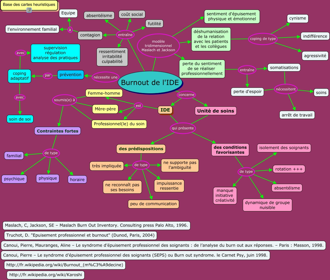 Cette carte de concepts créée avec IHMC CmapTools traite de: L'infirmière, Femme-homme soumis(e) à Contraintes fortes, Contraintes fortes de type physique, Professionnel(le) du soin soumis(e) à Contraintes fortes, Burnout de l'IDE entraîne coût social, somatisations nécessitent soins, Mère-père soumis(e) à Contraintes fortes, Burnout de l'IDE modèle tridimensionnel Maslach et Jackson déshumanisation de la relation avec les patients et les collègues, perte du sentiment de se réaliser professionnellement entraîne perte d'espoir, contagion à Equipe, des conditions favorisantes de type rotation +++, Contraintes fortes de type horaire, des prédispositions de type très impliquée, déshumanisation de la relation avec les patients et les collègues coping de type agressivité, perte d'espoir nécessitent soins, prévention par coping adaptatif, des prédispositions de type impuissance ressentie, coping adaptatif avec soin de soi, Burnout de l'IDE nécessite une prévention, déshumanisation de la relation avec les patients et les collègues coping de type indifférence, des conditions favorisantes de type isolement des soignants