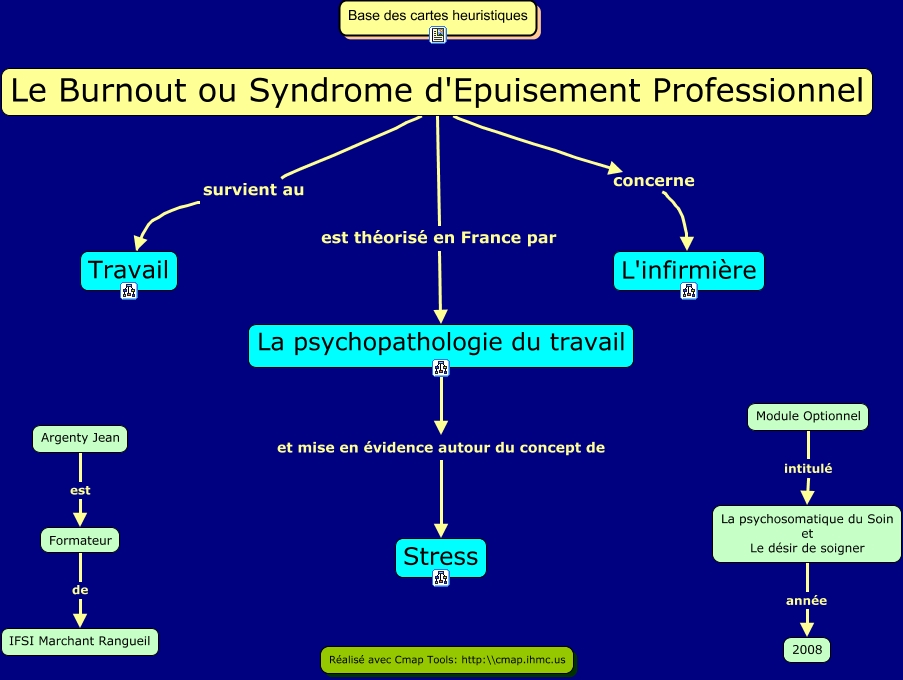 Cette carte de concepts créée avec IHMC CmapTools traite de: PlanBurnout, Le Burnout ou Syndrome d'Epuisement Professionnel survient au Travail, Formateur de IFSI Marchant Rangueil, La psychopathologie du travail et mise en évidence autour du concept de Stress, Le Burnout ou Syndrome d'Epuisement Professionnel est théorisé en France par La psychopathologie du travail, Module Optionnel intitulé La psychosomatique du Soin et Le désir de soigner, Argenty Jean est Formateur, La psychosomatique du Soin et Le désir de soigner année 2008, Le Burnout ou Syndrome d'Epuisement Professionnel concerne L'infirmière
