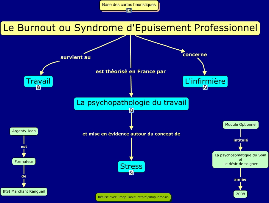 Cette carte de concepts créée avec IHMC CmapTools traite de: Plan, La psychopathologie du travail et mise en évidence autour du concept de Stress, Formateur de IFSI Marchant Rangueil, Le Burnout ou Syndrome d'Epuisement Professionnel survient au Travail, Module Optionnel intitulé La psychosomatique du Soin et Le désir de soigner, Le Burnout ou Syndrome d'Epuisement Professionnel est théorisé en France par La psychopathologie du travail, Argenty Jean est Formateur, Le Burnout ou Syndrome d'Epuisement Professionnel concerne L'infirmière, La psychosomatique du Soin et Le désir de soigner année 2008