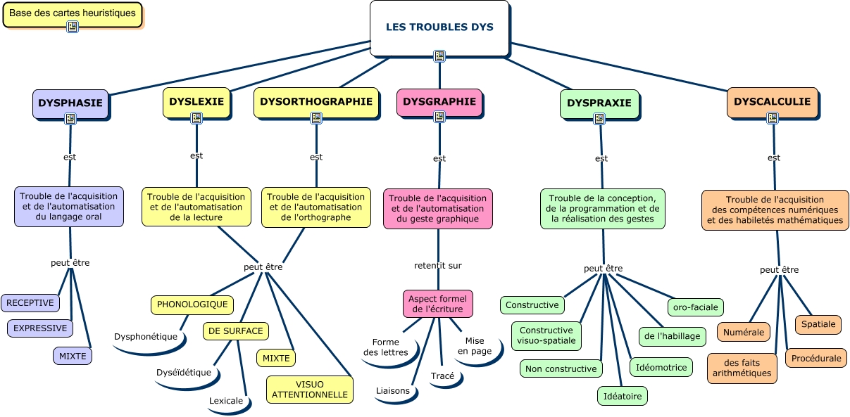 Cette carte de concepts créée avec IHMC CmapTools traite de: Troubles DYS, Trouble de l'acquisition et de l'automatisation de l'orthographe peut être VISUO ATTENTIONNELLE, Trouble de l'acquisition et de l'automatisation du langage oral peut être MIXTE, Aspect formel de l'écriture Liaisons, Trouble de l'acquisition et de l'automatisation du langage oral peut être EXPRESSIVE, Trouble de l'acquisition et de l'automatisation de la lecture peut être VISUO ATTENTIONNELLE, DYSPHASIE est Trouble de l'acquisition et de l'automatisation du langage oral, Trouble de la conception, de la programmation et de la réalisation des gestes peut être de l'habillage, Trouble de la conception, de la programmation et de la réalisation des gestes peut être Non constructive, Trouble de l'acquisition et de l'automatisation du geste graphique retentit sur Aspect formel de l'écriture, Trouble de l'acquisition et de l'automatisation de la lecture peut être PHONOLOGIQUE, LES TROUBLES DYS DYSGRAPHIE, Trouble de la conception, de la programmation et de la réalisation des gestes peut être Idéomotrice, PHONOLOGIQUE Dysphonétique, Trouble de la conception, de la programmation et de la réalisation des gestes peut être Idéatoire, Trouble de l'acquisition et de l'automatisation de l'orthographe peut être PHONOLOGIQUE, Trouble de l'acquisition et de l'automatisation du langage oral peut être RECEPTIVE, DYSCALCULIE est Trouble de l'acquisition des compétences numériques et des habiletés mathématiques, Trouble de la conception, de la programmation et de la réalisation des gestes peut être oro-faciale, Trouble de l'acquisition des compétences numériques et des habiletés mathématiques peut être Numérale, LES TROUBLES DYS DYSPRAXIE