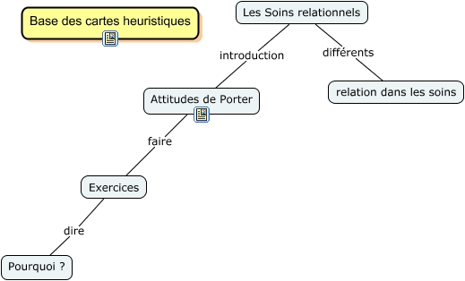 Cette carte de concepts créée avec IHMC CmapTools traite de: Les soins relationnels, Exercices dire Pourquoi ?, Attitudes de Porter faire Exercices, Les Soins relationnels introduction Attitudes de Porter, Les Soins relationnels différents relation dans les soins