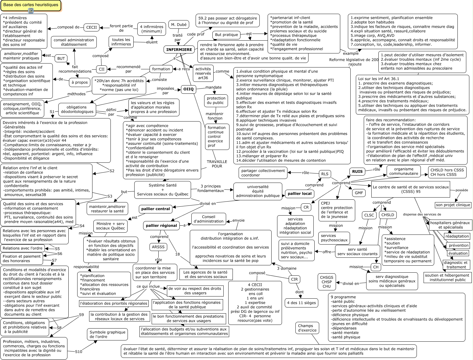 Cette carte de concepts créée avec IHMC CmapTools traite de: 1803-enjeux légaux et déonto, CR mission services adpatation réadaptation intégration social, RUIS rôle faire des recommandation: - l'offre de service, l'instauration de corridors de service et la prévention des ruptures de service -la formation médicale et la répartition des étudients, la coordination des activités de recherche et le transfert des connaissances -l'organisation des service méd spécialisés pour amélioré l'efficacité et éviter les dédoublements -l'élaboration de plan de l'effectif ,médical univ en relation avec le plan régional d'eff méd., CPEJ centre protection de l'enfance et de la jeunesse mission services psychosociaux, activités reservés art36 comme 1.évalue condition physique et mental d'une personne symptomatique 2.exerce surveillance clinique, monitorer, ajuster PTI 3.initier mesures diagnostiques et thérapeutiques selon ordonnance (la pilule) 4.initier mesures de dépistage selon loi sur la santé publique 5.effectuer des examen et tests diagnostiques invasifs selon Rx 6.effectuer et ajuster Tx médicaux selon Rx 7.déterminer plan de Tx relié aux plaies et prodigues soins 8.appliquer techniques invasives 9.suivi de grossesse, pratique d'Accouchement et suivi postnatal 10.suivi inf aupres des personnes présentent des problèmes de santé complexes. 11.adm et ajuster médicaments et autres substances lorsqu' il fon objet d'un Rx 12.procéder à la vaccination (loi sur la santé publique)PIQ 13.mélanger et préparer Rx 14.décider l'utilisation de mesures de contention, toutes les infirmieres eluent 4 infirmières (minimum), BUT est améliorer,modifier maintenir pratiques, pallier régional a Conseil d'administration, INFIRMIERE a obligations déodontologiques, *partenariat inf-client *promotion de la santé *prevention de la maladie, accidents prolemes sociaux et du suicide *processus thérapeutque *réadaptation fonctionnelle *qualité de vie *l'engagement professionnel example 1.exprime sentiment, planification ensemble 2.adopte bon habitudes 3.indique les facteurs de risques, connaitre mesure diag 4.expli situation santé, rassuré,collabore 5.image corp, AVQ,AVD 6.apprécie, accompagne, connait droits et responsabilité 7.conception, loi, code,leadership, informer., RLS rôle partager collectivement coordoner, obligations déodontologiques S1 Devoirs inhérents à l'exercice de la profession -Généralités -Integrité: incident/accident -État compromettant la qualité des soins et des services: évaluer capac exercer(a16)voir 44 -Compétance:limits de connaissance, rester a jr -Indépendance professionnelle et conflits d'intérêts: réel, apparent, portentiel: argent, info, influence -Disponibilité et diligance, à propos de *qualité des actes inf *règles des soins *distribution des soins *organisation scientifique et technique *évaluation-maintien de competences inf, RLS comprend organisme communautaire, CIR composé 4 CECII 2 gestionnaires ens coll 1 ens uni 1 expertise 2 auxil de commité prési DG de lagence ou inf CIR- 4 personne resource(pas vote), Relation entre l'inf et le client -relation de confiance -dispositions visant à préserver le secret quant aux renseignements de la nature confidentielle -comportements prohibés: pas amitié, intimes, amoureux, sexuelsa38 S3 Qualité des soins et des services -information et consentement -processus thérapeutique: PTI, survailance, continuité des soins prendre moyen raisonable(a44), med, coordonner la mise en place des services sur son territoire ce qui inclue l'élaboration des priorités régionales, Le centre de santé et de services sociaux (CSSS) 95 dispense des services de hospitaliers généraux et spécialisés, Devoirs inhérents à l'exercice de la profession -Généralités -Integrité: incident/accident -État compromettant la qualité des soins et des services: évaluer capac exercer(a16)voir 44 -Compétance:limits de connaissance, rester a jr -Indépendance professionnelle et conflits d'intérêts: réel, apparent, portentiel: argent, info, influence -Disponibilité et diligance S2 Relation entre l'inf et le client -relation de confiance -dispositions visant à préserver le secret quant aux renseignements de la nature confidentielle -comportements prohibés: pas amitié, intimes, amoureux, sexuelsa38, Conditions et modalités d'exercice du droit du client à l'accès et à la rectificationdes renseignements contenus dans tout dossier constitué à son sujet -dispositions applicable aux inf exerçant dans le secteur public --dans secteurs autres -obligations pour l'inf exercant dans autre de remettre des documents au client S8 Conditions, obligations et prohibitions relatives à la publicité, coordonner la mise en place des services sur son territoire ce qui inclue l'allocation des budgets et/ou subventions aux établissements et organismes communautaires