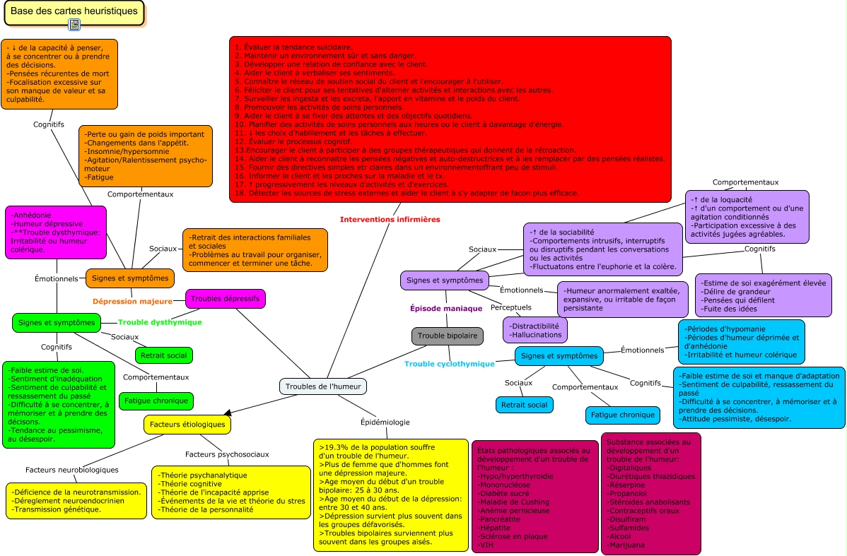 Cette carte de concepts créée avec IHMC CmapTools traite de: Analgésiques opiacés, Signes et symptômes Comportementaux Fatigue chronique, Signes et symptômes Comportementaux -Perte ou gain de poids important -Changements dans l'appétit. -Insomnie/hypersomnie -Agitation/Ralentissement psycho- moteur -Fatigue, Signes et symptômes Sociaux -Retrait des interactions familiales et sociales -Problèmes au travail pour organiser, commencer et terminer une tâche., Signes et symptômes Cognitifs -Faible estime de soi. -Sentiment d'inadéquation -Sentiment de culpabilité et ressassement du passé -Difficulté à se concentrer, à mémoriser et à prendre des décisons. -Tendance au pessimisme, au désespoir., Signes et symptômes Émotionnels -Anhédonie -Humeur dépressive -**Trouble dysthymique: Irritabilité ou humeur colérique., Troubles de l'humeur Épidémiologie ᡋ.3% de la population souffre d'un trouble de l'humeur. >Plus de femme que d'hommes font une dépression majeure. >Age moyen du début d'un trouble bipolaire: 25 à 30 ans. >Age moyen du début de la dépression: entre 30 et 40 ans. >Dépression survient plus souvent dans les groupes défavorisés. >Troubles bipolaires surviennent plus souvent dans les groupes aisés., Signes et symptômes Comportementaux Fatigue chronique, Facteurs étiologiques Facteurs psychosociaux -Théorie psychanalytique -Théorie cognitive -Théorie de l'incapacité apprise -Événements de la vie et théorie du stres -Théorie de la personnalité, Signes et symptômes Sociaux -↑ de la sociabilité -Comportements intrusifs, interruptifs ou disruptifs pendant les conversations ou les activités -Fluctuatons entre l'euphorie et la colère., Signes et symptômes Cognitifs -Estime de soi exagérément élevée -Délire de grandeur -Pensées qui défilent -Fuite des idées, Troubles dépressifs Dépression majeure Signes et symptômes, Signes et symptômes Émotionnels -Humeur anormalement exaltée, expansive, ou irritable de façon persistante, Signes et symptômes Cognitifs -Faible estime de soi et manque d'adaptation -Sentiment de culpabilité, ressassement du passé -Difficulté à se concentrer, à mémoriser et à prendre des décisions. -Attitude pessimiste, désespoir., Troubles de l'humeur ???? Troubles dépressifs, Signes et symptômes Sociaux Retrait social, Troubles de l'humeur Interventions infirmières 1. Évaluer la tendance suicidaire. 2. Maintenir un environnement sûr et sans danger. 3. Développer une relation de confiance avec le client. 4. Aider le client à verbaliser ses sentiments. 5. Connaître le réseau de soutien social du client et l'encourager à l'utiliser. 6. Féliciter le client pour ses tentatives d'alterner activités et interactions avec les autres. 7. Surveiller les ingesta et les excreta, l'apport en vitamine et le poids du client. 8. Promouvoir les activités de soins personnels. 9. Aider le client à se fixer des attentes et des objectifs quotidiens. 10. Planifier des activités de soins personnels aux heures ou le client à davantage d'énergie. 11. ↓ les choix d'habillement et les tâches à effectuer. 12. Évaluer le processus cognitif. 13.Encourager le client à participer à des groupes thérapeutiques qui donnent de la rétroaction. 14. Aider le client à reconnaitre les pensées négatives et auto-destructrices et à les remplacer par des pensées réalistes. 15. Fournir des directives simples etr claires dans un environnementoffrant peu de stimuli. 16. Informer le client et les proches sur la maladie et le tx. 17. ↑ progressivement les niveaux d'activités et d'exercices. 18. Détecter les sources de stress externes et aider le client à s'y adapter de facon plus efficace., Signes et symptômes Sociaux Retrait social, Troubles de l'humeur ???? Trouble bipolaire, Trouble bipolaire Épisode maniaque Signes et symptômes, Signes et symptômes Émotionnels -Périodes d'hypomanie -Périodes d'humeur déprimée et d'anhédonie -Irritabilité et humeur colérique