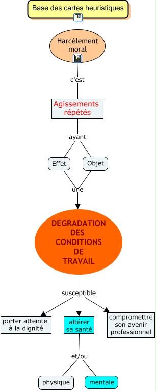 Cette carte de concepts créée avec IHMC CmapTools traite de: harcelement, DEGRADATION DES CONDITIONS DE TRAVAIL susceptible porter atteinte à la dignité, Agissements répétés ayant Effet, Agissements répétés ayant Objet, Effet une DEGRADATION DES CONDITIONS DE TRAVAIL, altérer sa santé et/ou physique, Harcèlement moral c'est Agissements répétés, DEGRADATION DES CONDITIONS DE TRAVAIL susceptible compromettre son avenir professionnel, altérer sa santé et/ou mentale, Objet une DEGRADATION DES CONDITIONS DE TRAVAIL, DEGRADATION DES CONDITIONS DE TRAVAIL susceptible altérer sa santé